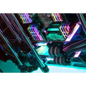 Montados tanto en la CPU como en la GPU, se encuentran los bloques de agua Phanteks Glacier, acabados en cromo y con placas posteriores a juego, son completamente personalizables con su iluminación RGB direccionable.