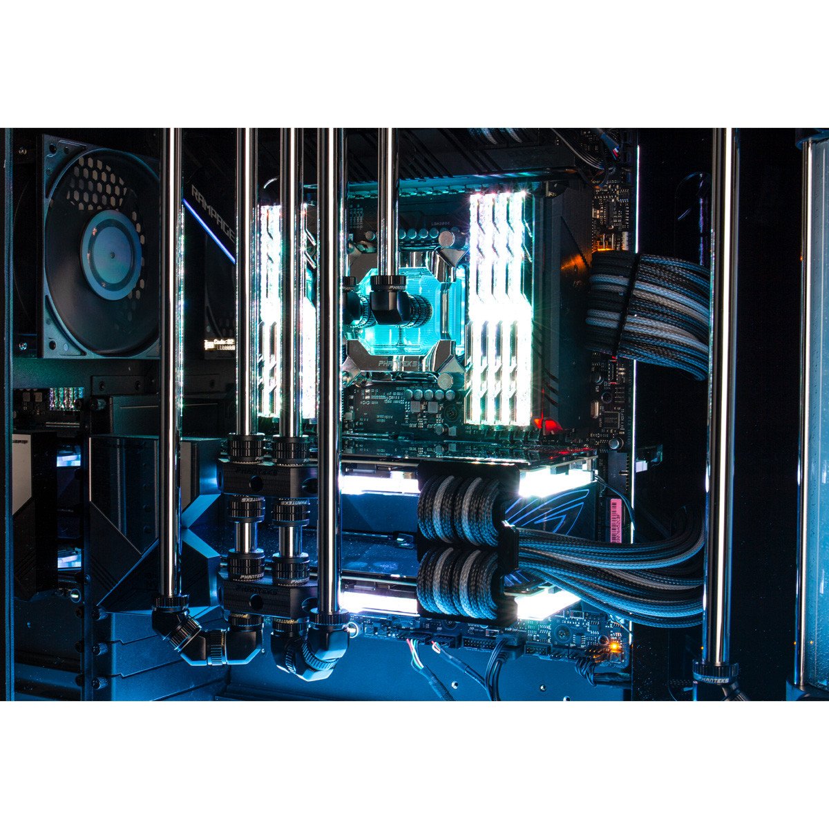 Las placas de paso de acrílico redistribuyen el refrigerante entre cuatro radiadores EK CoolStream. Dos radiadores de 480 mm proporcionaron refrigeración exclusiva para el RTX 2080 Ti dual, con un raditador adicional de 360 mm y 240 mm trabajando al unísono para enfriar el Intel Extreme i9-9990XE overclockeado.