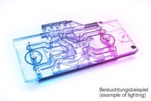 Este enfriador cubre todos los componentes necesarios que requieren enfriamiento. Esto incluye los convertidores de voltaje, la memoria gráfica y, por supuesto, la GPU. Todos los puntos de acceso conocidos de las tarjetas gráficas se enfrían completamente con agua.