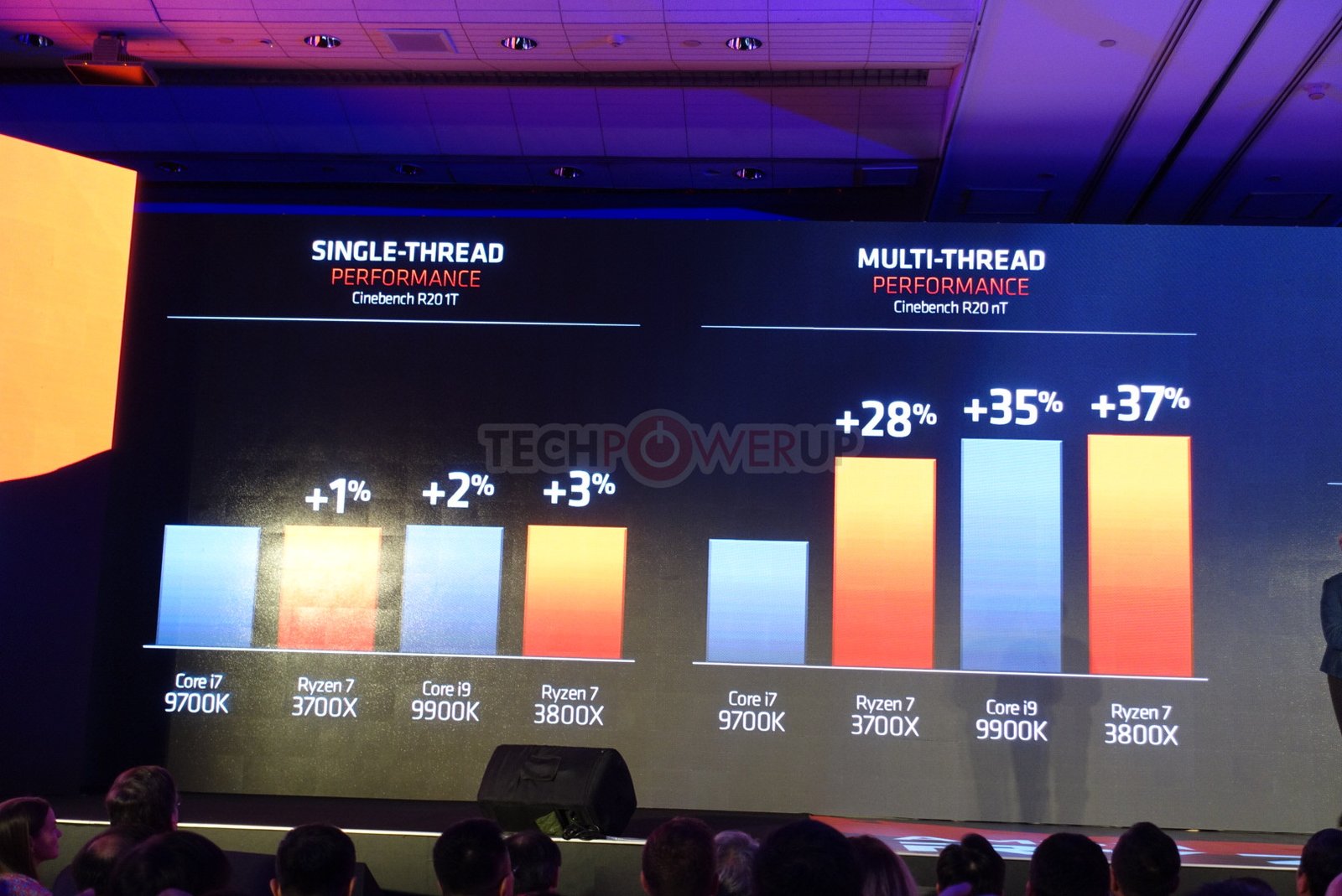 AMD presentó tres SKU de gama alta por ahora, el $ 329 Ryzen 7 3700X, el $ 399 Ryzen 7 3800X y el $ 499 Ryzen 9 3900X. El 3700X y el 3800X son piezas de 8 núcleos / 16 hilos con un chiplet de CPU único. El 3700X tiene una velocidad de reloj de 3.60 GHz con una frecuencia de impulso máxima de 4.40 GHz, solo 65 vatios TDP y será mejor que el Core i7-9700K de Intel, tanto en juegos como en productividad. Los 3800X superan a los de 3,90 GHz nominales, 4,50 GHz de impulso, 105W TDP y superaron al Core i9-9900K en juegos y productividad. AMD dio un paso más en el lanzamiento de la nueva marca Ryzen 9 con el 3900X, que es un procesador de 12 núcleos / 24 hilos con velocidad de reloj de 3.80 GHz, 4.60 boost, 72 MB de caché total, 105W TDP y un rendimiento que no solo supera al i9-9900K, pero también al procesador HEDT i9-9920X de 12 núcleos / 24 hilos a pesar de tener dos canales de memoria menos. AMD se centró en el rendimiento del juego con Zen 2, con una FPU más amplia, una mejor predicción de sucursales y varias mejoras de microarquitectura que contribuyen a un rendimiento por núcleo superior al de Intel. Los procesadores saldrán a la venta el 7/7/2019.
