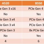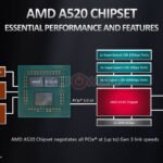 Las placas base basadas en AMD A520 carecen por completo de compatibilidad con PCIe Gen 4, incluso con un procesador Ryzen 3000 “Matisse”. Incluso las ranuras PCI-Express x16 y M.2 NVMe conectadas al SoC AM4 están limitadas a PCIe Gen 3. En el B550, estas dos ranuras funcionan a velocidades de Gen 4 cuando se combinan con un procesador capaz. Al igual que el B550, los carriles PCIe descendentes (de uso general) del chipset funcionan a velocidades PCIe Gen 3, aunque a diferencia del B550, el chipset solo emite 6 carriles. La E / S de otra plataforma incluye hasta cinco puertos USB 3.2 de 10 Gbps (incluye dos del SoC AM4), dos puertos USB 3.1 de 5 Gbps, cuatro puertos SATA de 6 Gb / s (solo AHCI) y seis puertos USB 2.0. En el lanzamiento, las placas base A520 solo son compatibles con los procesadores Ryzen 3000 “Matisse”, y el soporte está previsto para los procesadores 4000G “Renoir” cuando se lancen en el canal minorista y en el futuro “