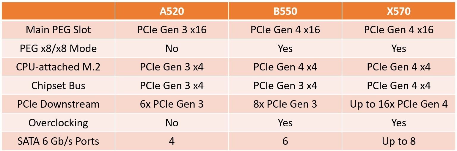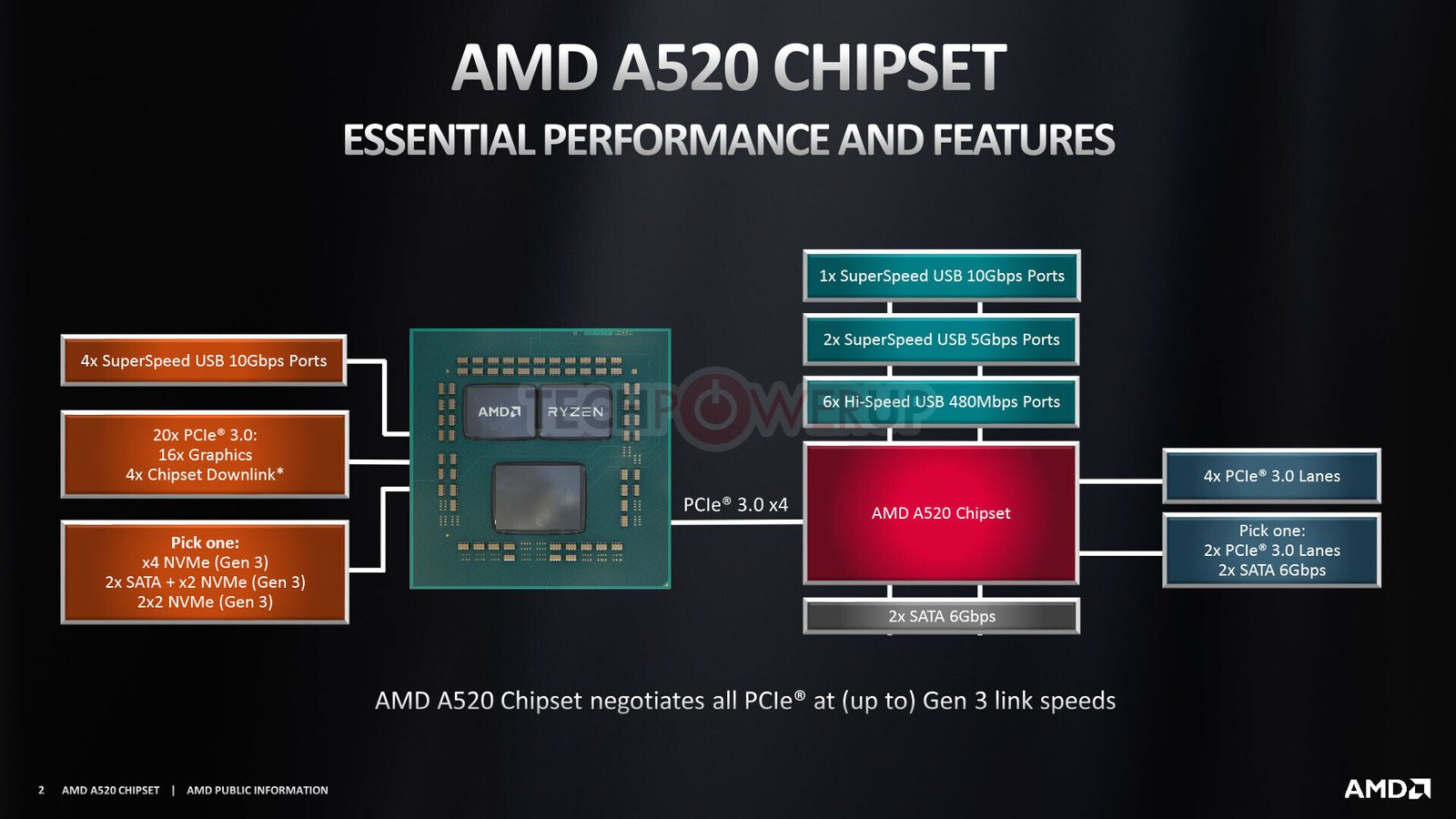 Las placas base basadas en AMD A520 carecen por completo de compatibilidad con PCIe Gen 4, incluso con un procesador Ryzen 3000 “Matisse”. Incluso las ranuras PCI-Express x16 y M.2 NVMe conectadas al SoC AM4 están limitadas a PCIe Gen 3. En el B550, estas dos ranuras funcionan a velocidades de Gen 4 cuando se combinan con un procesador capaz. Al igual que el B550, los carriles PCIe descendentes (de uso general) del chipset funcionan a velocidades PCIe Gen 3, aunque a diferencia del B550, el chipset solo emite 6 carriles. La E / S de otra plataforma incluye hasta cinco puertos USB 3.2 de 10 Gbps (incluye dos del SoC AM4), dos puertos USB 3.1 de 5 Gbps, cuatro puertos SATA de 6 Gb / s (solo AHCI) y seis puertos USB 2.0. En el lanzamiento, las placas base A520 solo son compatibles con los procesadores Ryzen 3000 “Matisse”, y el soporte está previsto para los procesadores 4000G “Renoir” cuando se lancen en el canal minorista y en el futuro “