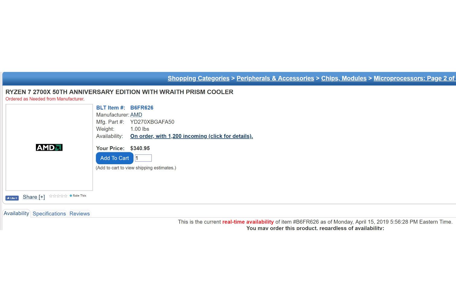 AMD celebra su 50 aniversario con un nuevo paquete de edición especial conmemorativa del procesador de escritorio de ocho núcleos Ryzen 7 2700X. Este paquete lleva el número de SKU de PIB “YD270XBGAFA50”. El minorista en línea estadounidense ShopBLT lo tenía listado por USD $ 340.95 antes de retirar el listado y marcarlo como “agotado”. La lista no incluye ninguna imagen ni detalles sobre el SKU, excepto que se incluye un enfriador de CPU Wraith Prism RGB (como suele ocurrir con el paquete PIB de 2700X).