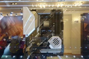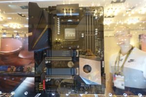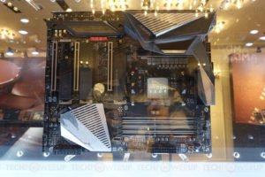 Entre las placas base que observamos a través de los estantes de vidrio se encuentran el ASRock X570 Taichi, cuyo diseño característico de steampunk que trata de ocultar el ventilador del chipset detrás de una rejilla. ASRock hace algo similar con el X570 Steel Legend (pero se duplica en la impresión de camuflaje digital). El GIGABYTE Aorus X570 Master es una monstruosidad con un enfoque de diseño en una CPU VRM escandalosamente fuerte que extrae la energía de dos conectores EPS de 8 pines, y una gran dosis en las áreas para las que GIGABYTE se ha ganado una reputación, como el audio integrado componentes, etc. También hay una placa GIGABYTE simple que muestra el conjunto de chips X570, con su matriz bastante grande (aproximadamente 130 mm²).