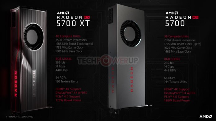 La otra área donde AMD está reforzando el RX 5700 es su músculo ráster. El RX 5700 tiene los mismos 64 ROP que el RX 5700 XT. AMD realizó este SKU al deshabilitar dos procesadores de grupos de trabajo (cuatro unidades de cómputo RDNA), reduciendo el número de procesadores de flujo a 2.304. Esto también reduce el número de TMU de 160 a 144. Las velocidades del reloj del motor de la GPU también se reducen, con 1465 MHz base, 1625 MHz “relojes de juego” y 1725 MHz impulso relojes; En comparación con 1605/1755/1905 MHz del RX 5700 XT. El RX 5700 tiene una potencia de placa típica de 180W en comparación con los 224W del RX 5700 XT. Las tarjetas de diseño personalizado pueden incluir solo una entrada de alimentación PCIe de 8 pines, mientras que algunos de los diseños superiores de overclocking de fábrica podrían usar configuraciones de 8 pines + 6 pines.