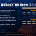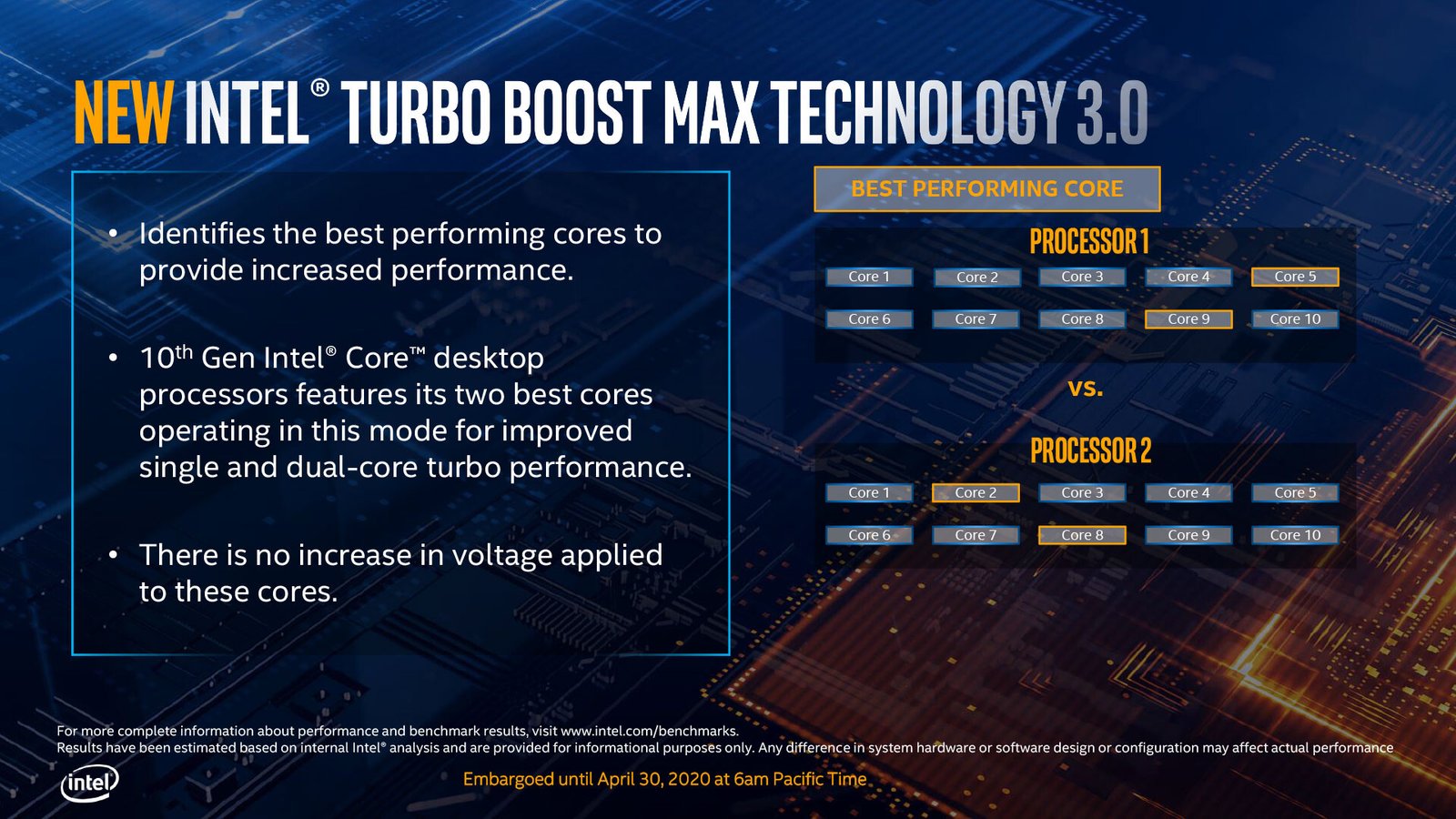 - Turbo Boost MAX 3.0: transferido de la familia de procesadores Core X HEDT, Turbo Boost Max 3.0 ahora está disponible en SKU 10th Gen Core i9 y Core i7, lo que permite niveles superiores de velocidad de reloj que Turbo Boost 2.0, y también agrega “Núcleos favorecidos “. Esto hace que el sistema operativo conozca los dos núcleos físicamente mejores, que pueden soportar frecuencias de impulso más altas mejor que el resto de la CPU. El objetivo es que el planificador del sistema operativo priorice las cargas de trabajo en ejecución en estos núcleos, para que puedan ejecutarse más rápido. Windows 10 ha tenido conocimiento de Favored Core desde 1609, y los núcleos Linux x64 desde enero de 2018 lo han admitido.