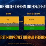 - Mejoras físicas en el empaque: Intel realizó algunas mejoras en el paquete del procesador con el objetivo de mejorar la transferencia de calor entre el troquel y la solución de enfriamiento. Sin cambiar la altura Z del paquete, Intel encontró una manera de espesar el IHS de cobre, al adelgazar la matriz de silicio (de 800 µm a 500 µm) y el sustrato de fibra de vidrio. TIM soldado (STIM) se encuentra entre la matriz y el IHS. Esto debería mejorar significativamente la transferencia de calor, ya que el silicio es un aislante térmico, mientras que el IHS de cobre es altamente conductor.