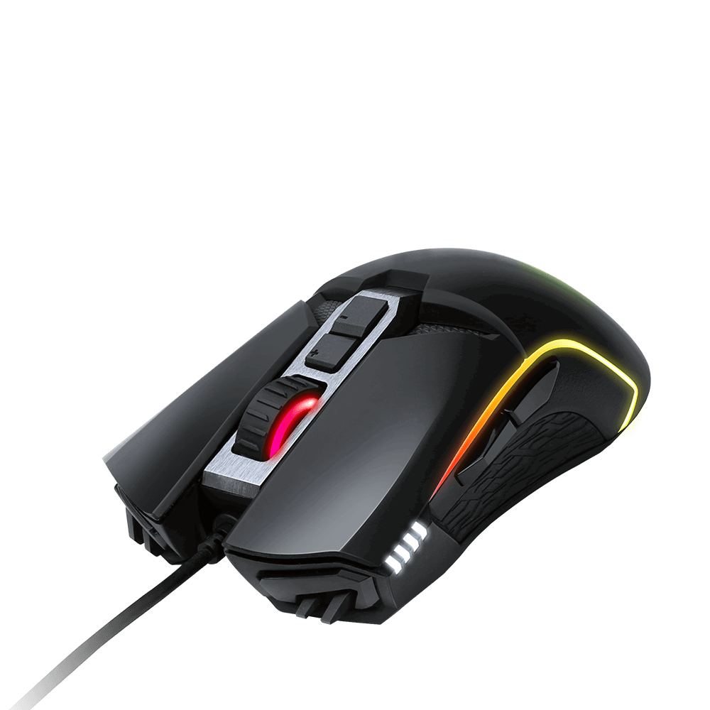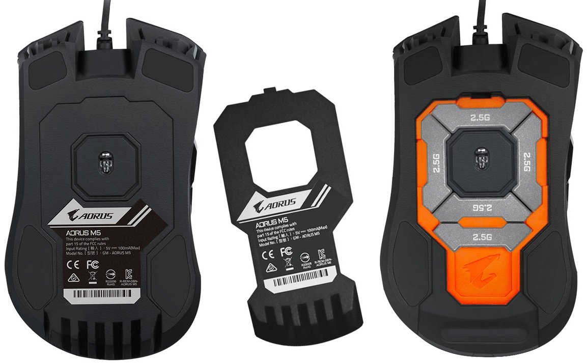 Al rededor del sensor tenemos 5 espacios donde podremos instalar hasta 5 pesos de 2.5 gramos de peso cada uno para aumentar el control del ratón y configurarlo a nuestro gusto (de 118 hasta los 130,5 gr), tenemos un total de 7 botones programables, los cuales hacen uso de unos interruptores mecánicos OMRON para una larga vida útil (50 millones de clics), un cable USB de 1.8 metros de largo protegido de nailon trenzado, y un sistema de iluminación LED RGB configurable en 16.8 millones de colores junto a un indicador LED para indicarnos la sensibilidad del sensor.