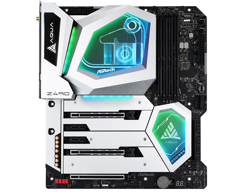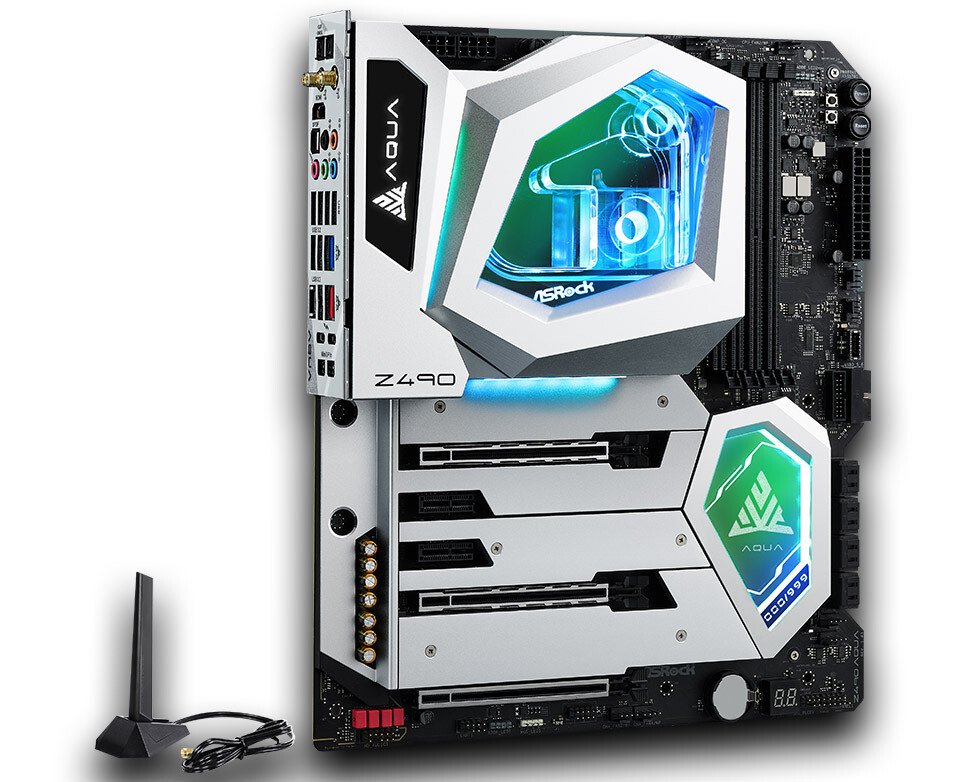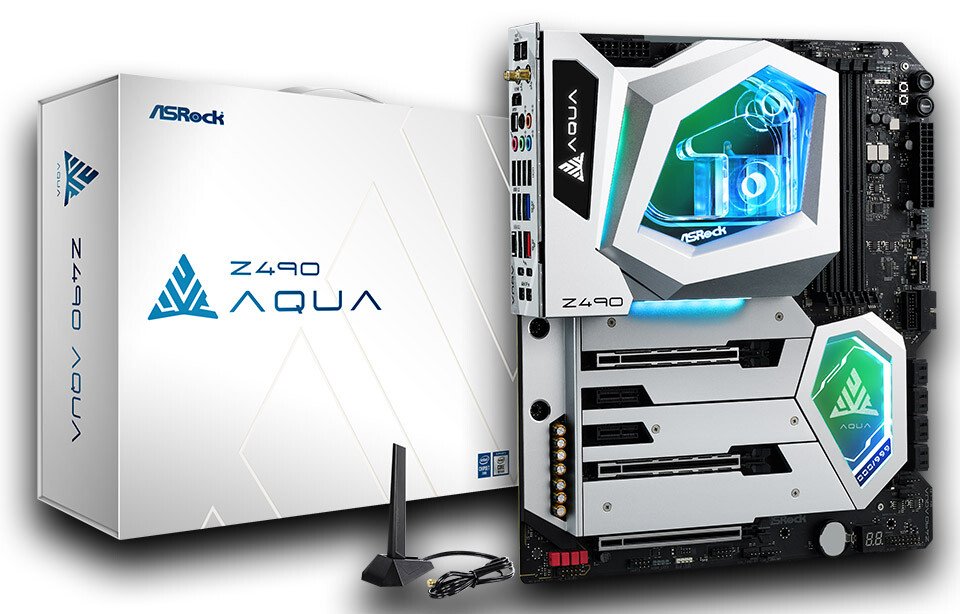 ASRock anuncia su última placa base insignia, la Z490 AQUA. Y para resaltar su lanzamiento, estan limitando el Z490 AQUA a solo 999 unidades, lo que lo hace extremadamente valioso. Utilizando los últimos 16 Phase 90 A Dr.MOS y 2 oz de cobre PCB, ofrece hasta un 95% de eficiencia VRM. Para mantener los VRM y los procesadores de 10 núcleos fríos incluso durante cargas pesadas sostenidas o incluso overclocking, el Z490 AQUA presenta un sistema avanzado de enfriamiento por agua que reduce el calor en los VRM de la CPU para reducir drásticamente las temperaturas de VRM.