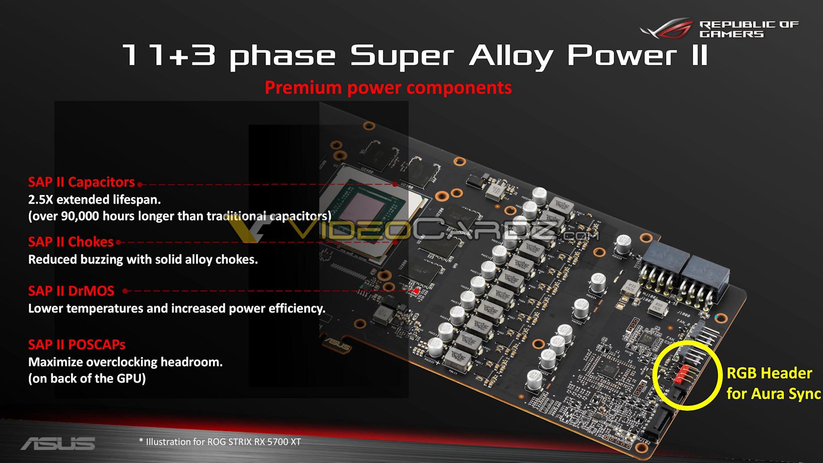 La ROG Strix RX 5700 XT OC es una tarjeta gráfica RX 5700 XT de diseño totalmente personalizado, con un PCB de diseño personalizado que es más grande que el diseño de referencia de AMD, y presenta un VRM de 14 fases (vGPU de 11 fases y vMem de 3 fases ) ASUS implementó su última selección de componentes Super Alloy Power II (SAP II), que consiste en estrangulaciones que no zumban ni se quejan; y DrMOS de alta calidad.