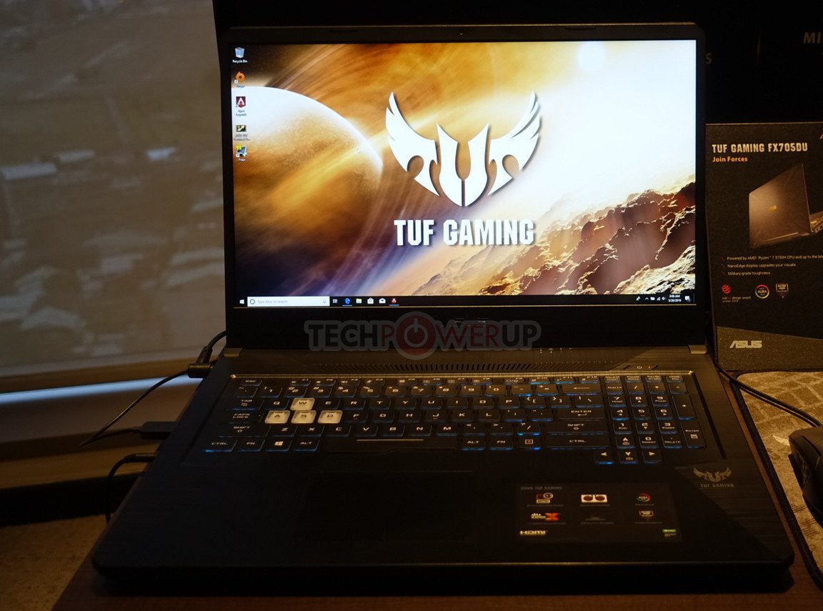 Continuando, finalmente llegamos al sistema de juego TUF del cual ASUS tenía la FX705DU y la FX505DU en pantalla. Ambas unidades cuentan con una CPU AMD Ryzen 7 3750H y hasta una GPU NVIDIA GeForce RTX 1660 Ti, lo que significa que es bastante similar al Zephyrus G GA502. Sin embargo, luce el apodo “TUF” lo que significa que pasó la prueba MIL-STD-810G. Cuando se trata de la pantalla, es un nivel NanoEdge IPS de 144 Hz que ofrece el 100% de la gama de colores sRGB. Cuando se trata del teclado, es RGB retroiluminado, como habrás adivinado.
