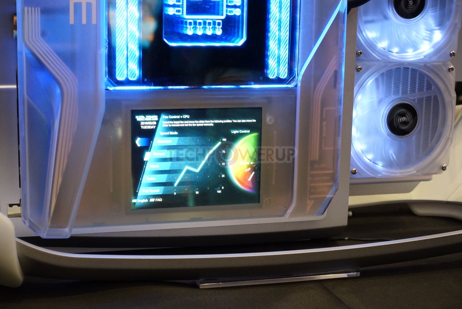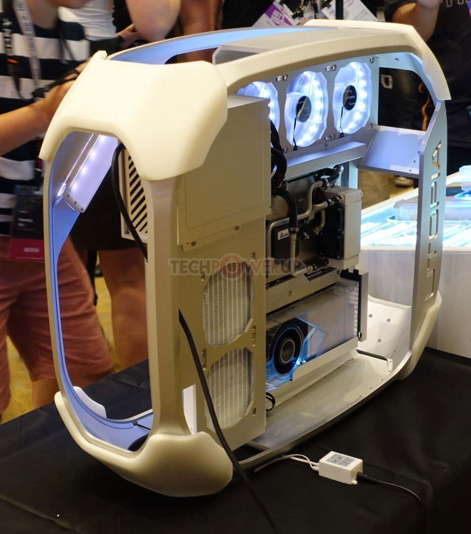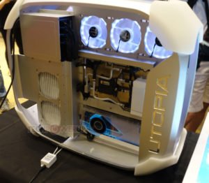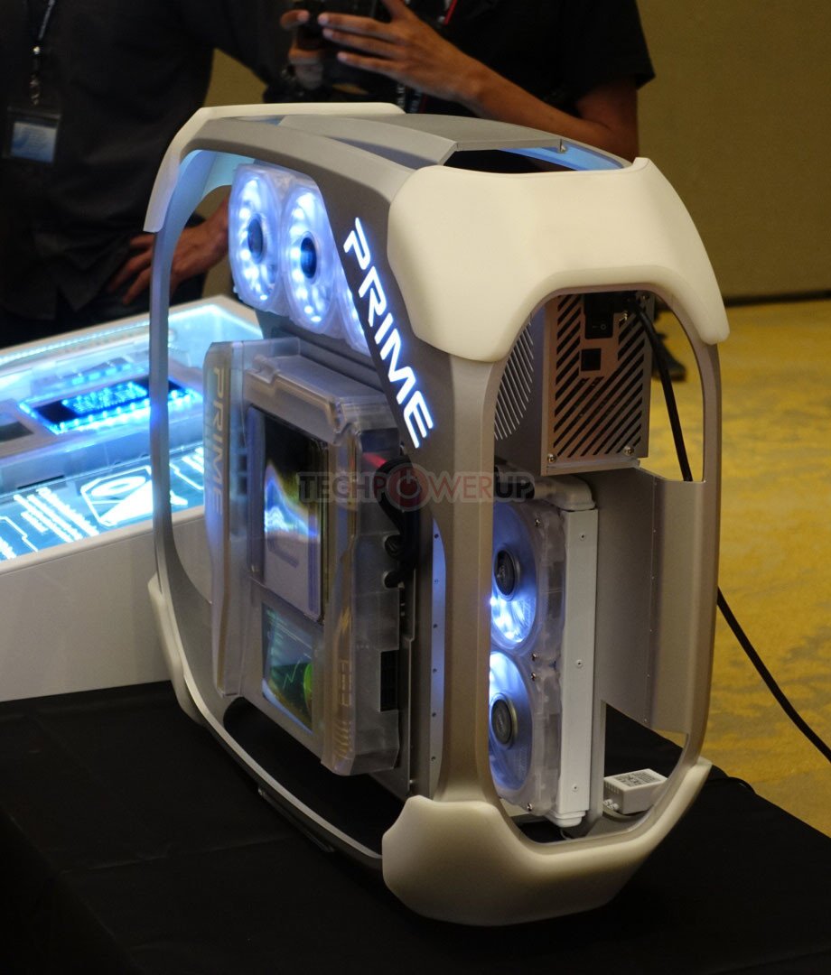 La Prime Utopia es otra cosa. Es un concepto de computadora de escritorio de alta gama construido alrededor de una placa base que tiene ranuras, encabezados, puertos y conectores en ambos lados de la PCB. Su “lado anverso”, si puede llamarlo así, tiene una cubierta que oculta las ranuras de memoria, la mayoría de los controladores, el chipset y una pantalla USB de 7 pulgadas que emite datos de monitoreo del sistema en tiempo real, o casi cualquier cosa que desee para mostrar. El zócalo de la CPU está en el otro lado de la PCB, y el procesador y la CPU VRM están refrigerados por líquido. Una ranura PCI-Express en ángulo sostiene la tarjeta gráfica a lo largo del plano de la placa base. Todo se junta en un marco de chasis similar al de CM Cosmos que le permite mostrar el interior de apagado.