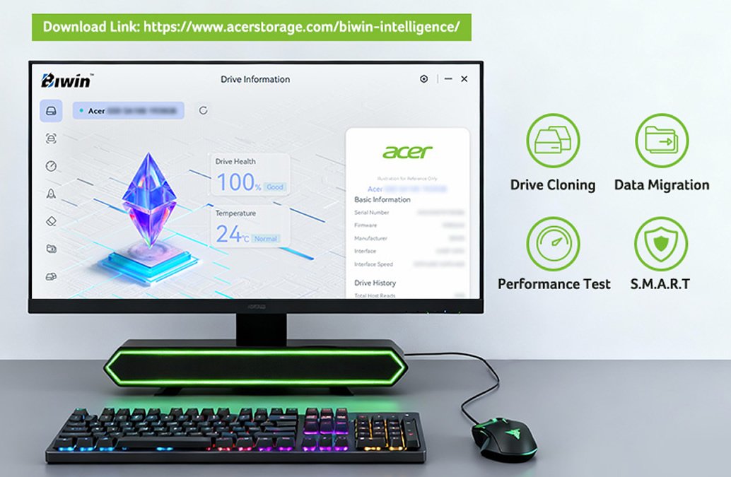Para facilitar la gestión del SSD, BIWIN incluye de manera gratuita el software Biwin Intelligence, una solución multifuncional de administración de almacenamiento diseñada para soportar los productos de almacenamiento de la marca Acer. Esta herramienta permite clonar unidades, transferir contenidos, evaluar el rendimiento del SSD y migrar datos de manera sencilla. Adicionalmente, los usuarios cuentan con el Biwin Data Recovery Tool, un software profesional de recuperación de datos que permite escanear y recuperar archivos perdidos de distintos medios de almacenamiento con capacidades de análisis profundo.
