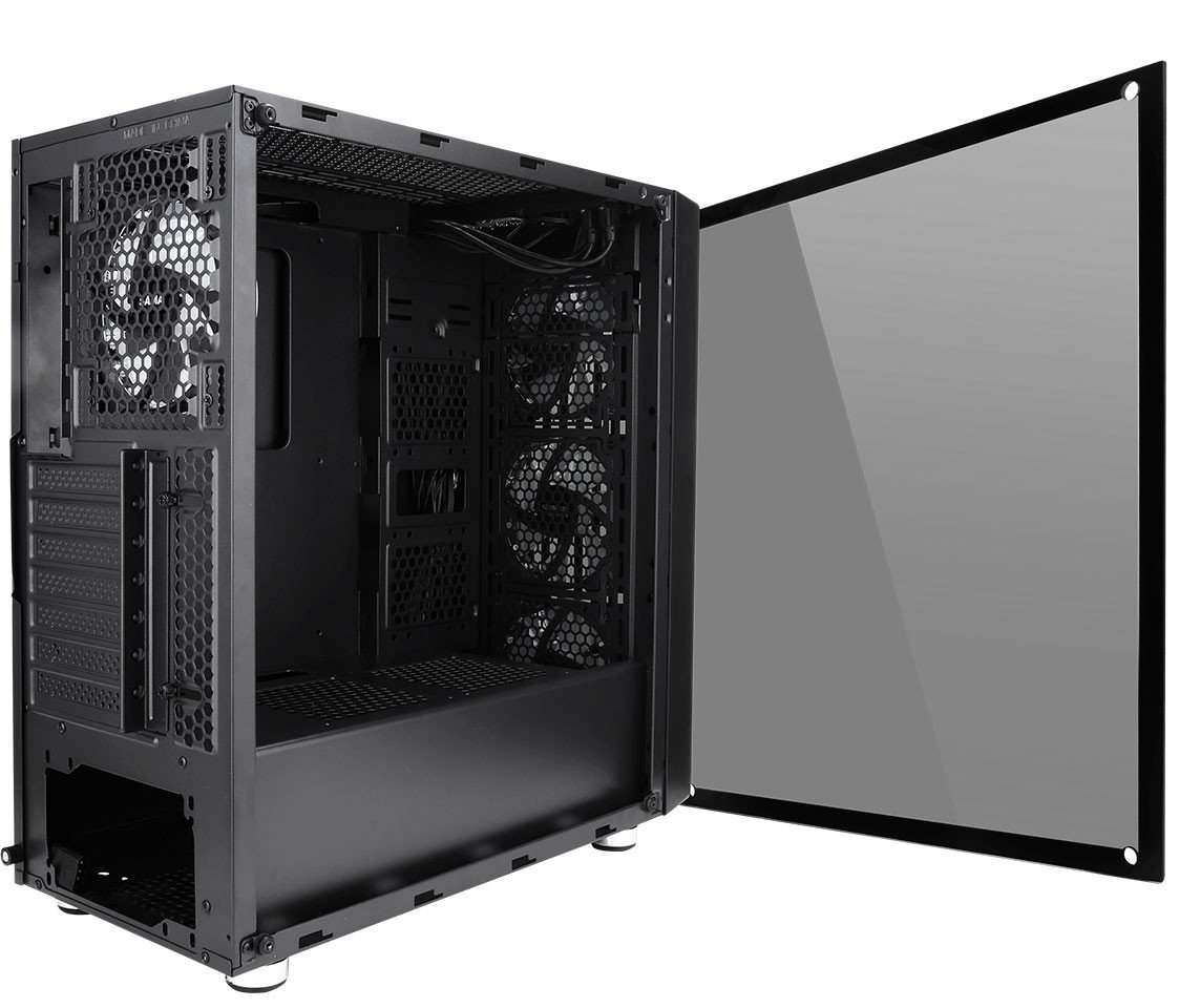 El panel frontal IO se colocó en el área frontal para un fácil acceso y permite que DIYPC utilice completamente un elegante panel de vidrio templado en la parte frontal para exhibir los ventiladores LED RGB preinstalados.