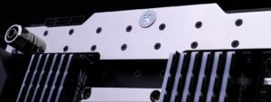 El EK-Velocity WS – La base de cobre mecanizada con precisión del bloque de agua de ILM (‘placa fría’) se fabrica a partir del cobre más puro disponible en el mercado y se trata con galvanoplastia de níquel. La parte superior es de metal, hecha de latón niquelado de calidad. Esto significa que el bloqueo es increíblemente resistente y durará mientras esté usando la plataforma. La insignia EK está iluminada con LED RGB y es compatible con todas las tecnologías populares de sincronización RGB de todos los principales fabricantes de placas base. La marca de flecha en el conector LED de 4 pines se alineará con la marca de + 12V en el encabezado RGB.