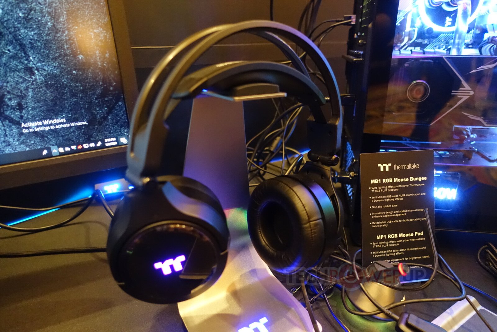 El mouse iría bien con el nuevo bungee de mouse M1 RGB (si lo está usando con cable) y la alfombrilla MP1 RGB, que cuenta con una superficie sintética equilibrada de velocidad / control y un elemento RGB que recorre su periferia. El auricular Riing Pro RGB 7.1 es la nueva oferta premium de Thermaltake: este par de paquetes de latas USB ESS ES9018 USB DAC y ESS Sabre ES9601K amplificador. Este hardware está conectado a controladores de 50 mm, y solo hay dos de ellos, es cierto, este es un auricular estéreo con 7.1 como un DSP virtual. Las latas cuentan con elementos LED RGB.