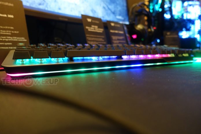 La placa frontal alrededor del grupo principal de teclas y las teclas de función son de aluminio plateado, mientras que una que rodea el grupo numérico, las flechas y las teclas de edición es de aluminio oscuro en contraste. El TK5 utiliza un diseño de tapa de teclado flotante, con un elemento LED RGB de cada tecla individual que produce un brillo alrededor de la tecla. También hay un difusor acrílico RGB LED que se extiende a lo largo de la periferia del teclado. Thermaltake está utilizando interruptores Cherry MX Blue o MX Speed Silver.