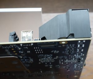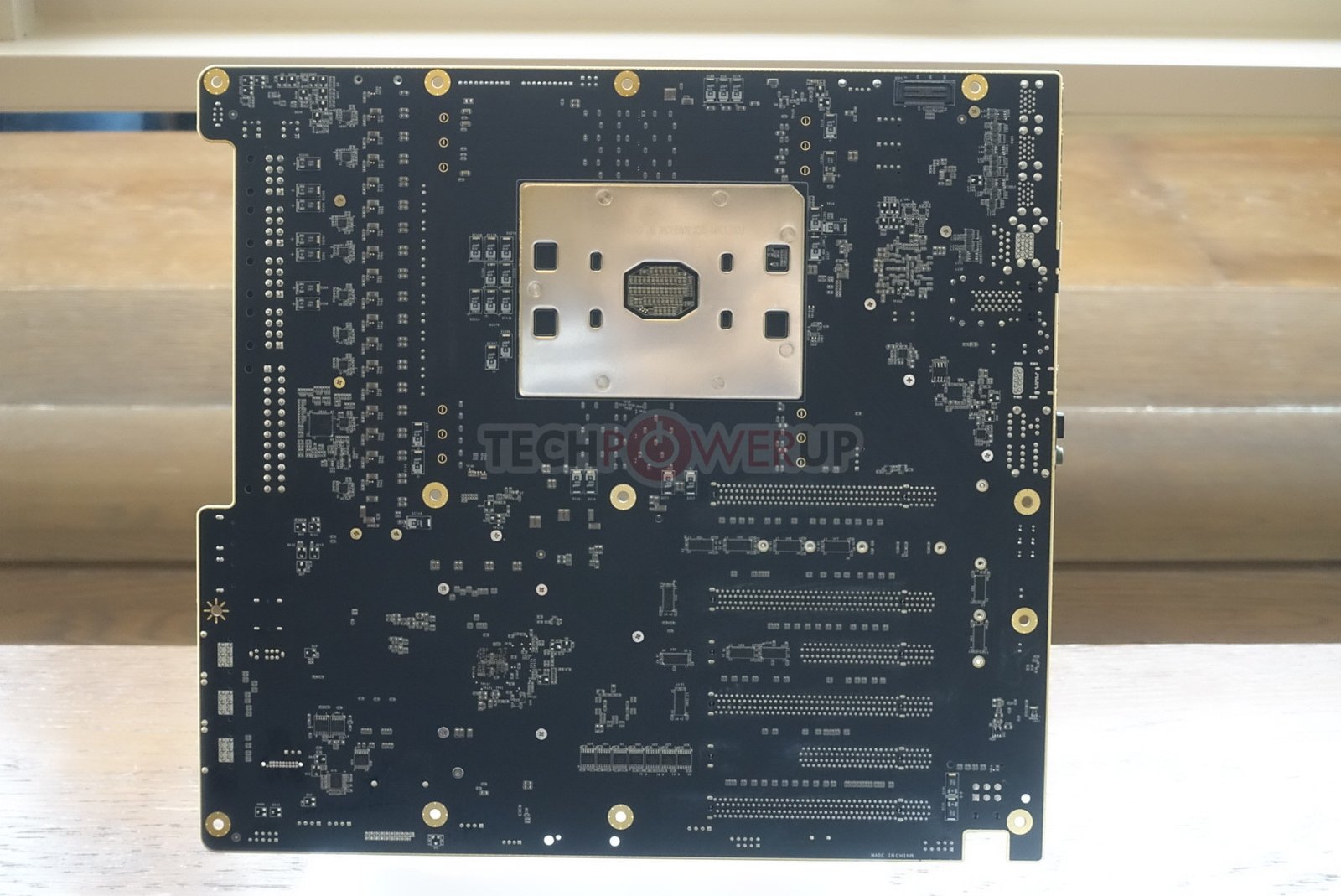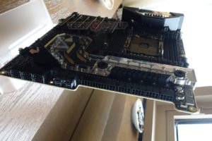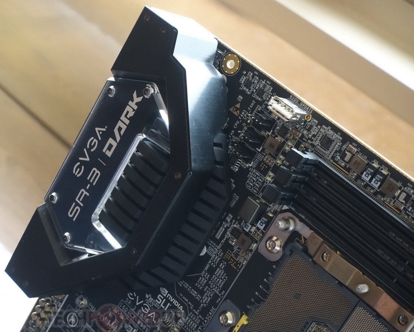 Para empezar, el zócalo de la CPU está orientado hacia los lados, al igual que el Z390 DARK, para colocar las ranuras de memoria DDR4 al norte y al sur del zócalo. Solo hay una ranura por canal de memoria, por lo que no tiene que preocuparse por que la topología de múltiples ranuras impida su memoria OC de ninguna manera. El VRM de la CPU se encuentra al este del zócalo, directamente junto a las entradas de alimentación en ángulo de la placa, que incluyen un ATX de 24 pines y cuatro entradas EPS de 8 pines. Hay entradas adicionales, como dos de alimentación SATA y una PCIe de 6 pines, para estabilizar los otros dominios de alimentación. El área de VRM, junto con el C621 PCH, se enfrían con líquido mediante un monobloque incrustado en un disipador de calor de aluminio. Este bloque tiene una parte superior de acrílico transparente, y su canal de refrigerante recorre primero el VRM de la CPU, antes de guiar el refrigerante a través de una red de aletas sobre el PCH y luego hacia la salida.