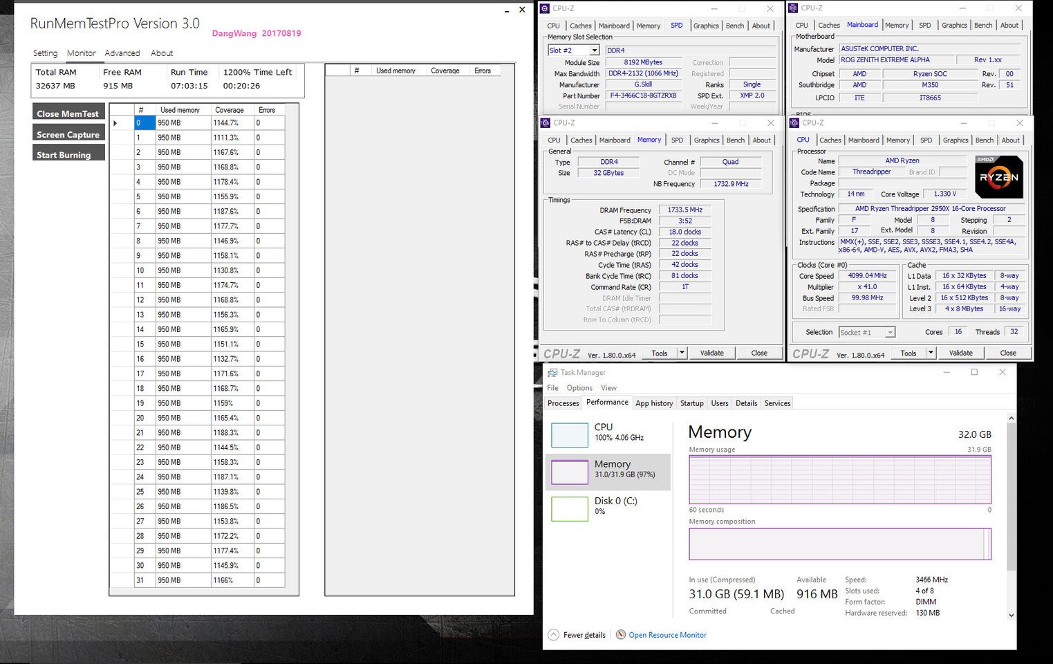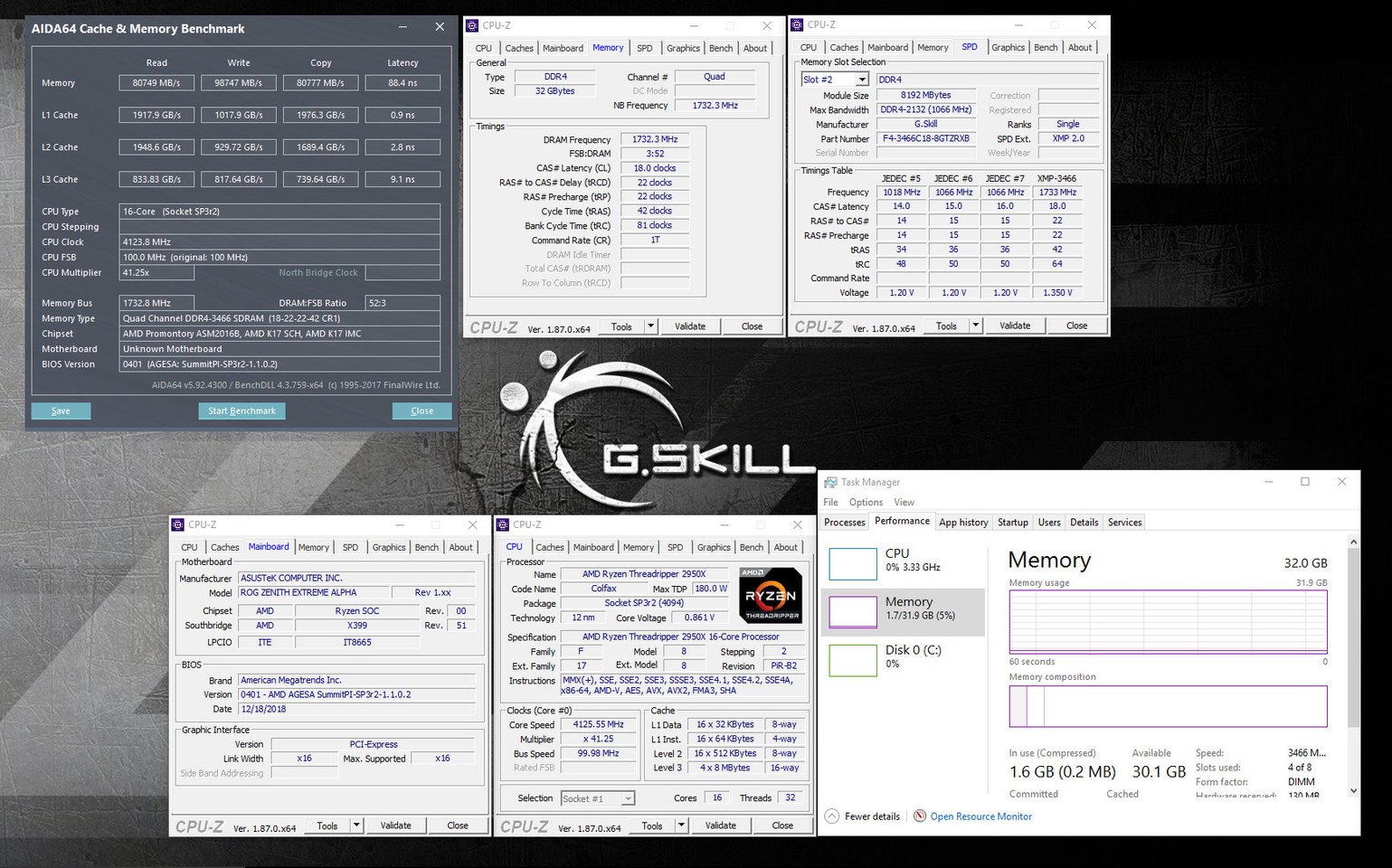Anteriormente, la velocidad DDR4 más alta disponible para la plataforma AMD X399 de G.SKILL era DDR4-3200. G.SKILL ahora está ampliando las especificaciones a DDR4-3466 bajo la configuración de cuatro canales. Este kit ha sido validado con la placa base ASUS ROG ZENITH EXTREME ALPHA y el procesador AMD Ryzen Threadripper 2950X, como se muestra en las siguientes capturas de pantalla.