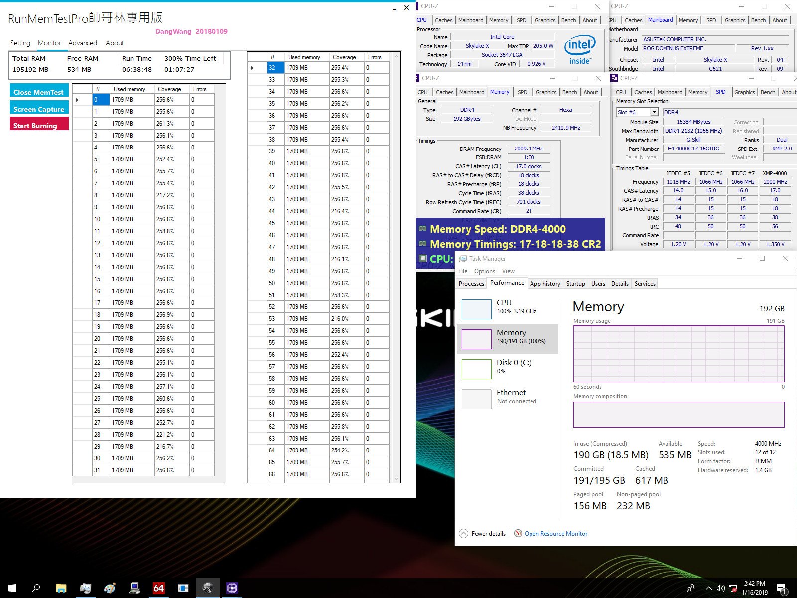 Con módulos de 16GB de alta capacidad, esta plataforma permite una capacidad de memoria máxima de 192GB con un kit de 16GBx12. Siendo el primero de su tipo, G.SKILL propulsó los 192GB completos a una velocidad extrema DDR4-4000 con tiempos CL17-18-18-38. La siguiente captura de pantalla muestra el kit de memoria Trident Z Royal 192GB de 12 módulos que está siendo probado y validado en el Asus ROG Dominus Extreme con el procesador Xeon W-3175X: para
