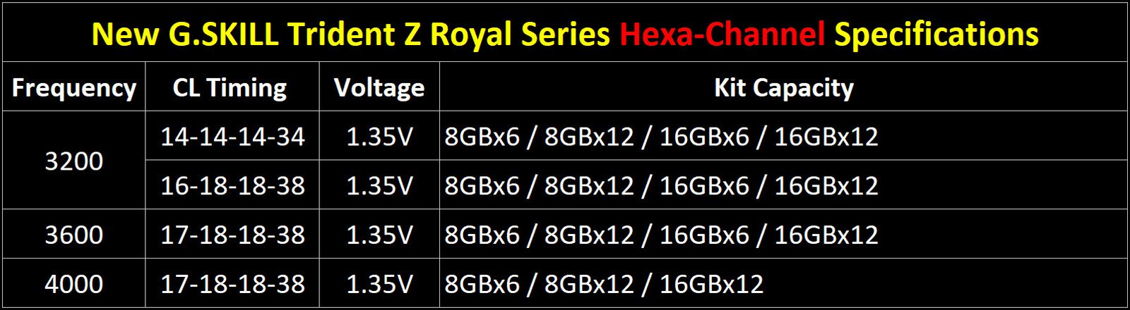 El fabricante líder mundial de periféricos de juego y memoria de rendimiento extremo, anuncia nuevas especificaciones de memoria Trident Z Royal DDR4 RGB ultrarrápidas y de capacidad ultraalta diseñadas para usar con el último desbloqueado Procesador Intel Xeon W-3175X de 28 núcleos. Operando en hexa-channel con configuraciones de kit de 6 ó 12 módulos, estos nuevos kits de memoria Trident Z Royal de 6 canales pueden alcanzar velocidades de memoria increíbles de hasta DDR4-4000 CL17-18-18-38 a 1.35 V, que presentan características extremas Rendimiento Samsung B-die memoria ICs. Con una velocidad de memoria rápida y una capacidad masiva, estos kits de memoria de canal hexagonal son perfectos para estaciones de trabajo con cargas de trabajo pesadas cuando se combinan con el procesador Xeon de 28 núcleos.