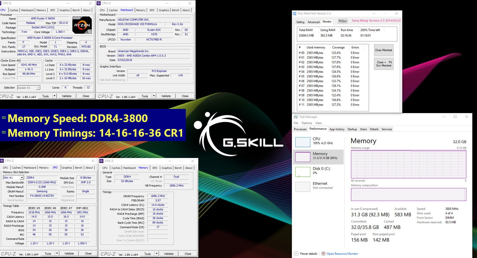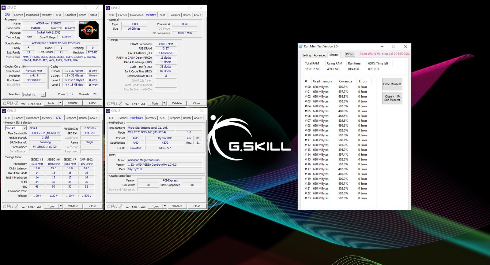Al igual que cualquier kit de memoria G.SKILL, las especificaciones deben permanecer completamente estables bajo una prueba de esfuerzo de memoria, como se muestra en las capturas de pantalla a continuación, que muestran el kit de memoria de 32 GB (8 GB x4) que funciona con una fórmula ASUS ROG CROSSHAIR VIII placa base con el procesador AMD Ryzen 5 3600X y el kit de memoria de 16 GB (8 GB x2) que se ejecuta en la placa base MSI MEG X570 GODLIKE con el procesador AMD Ryzen 9 3900X.