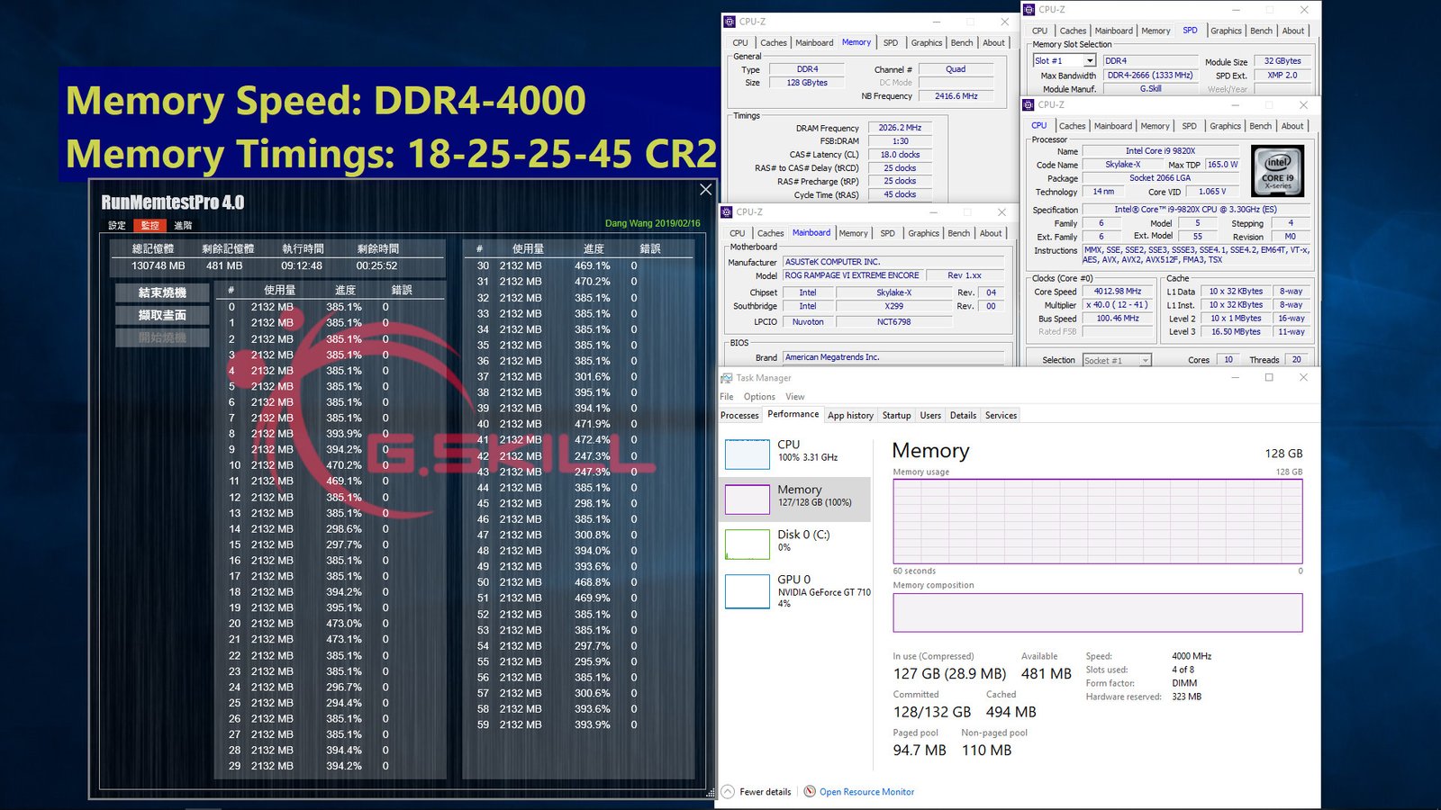 Los módulos de alta capacidad de 32 GB no son holgados cuando se trata de alta frecuencia, rompiendo DDR4-4000 CL18 con 128 GB ( 32GBx4), como se muestra con la placa base ASUS ROG Rampage VI Extreme Encore y el procesador Intel Core i9-9820X.