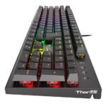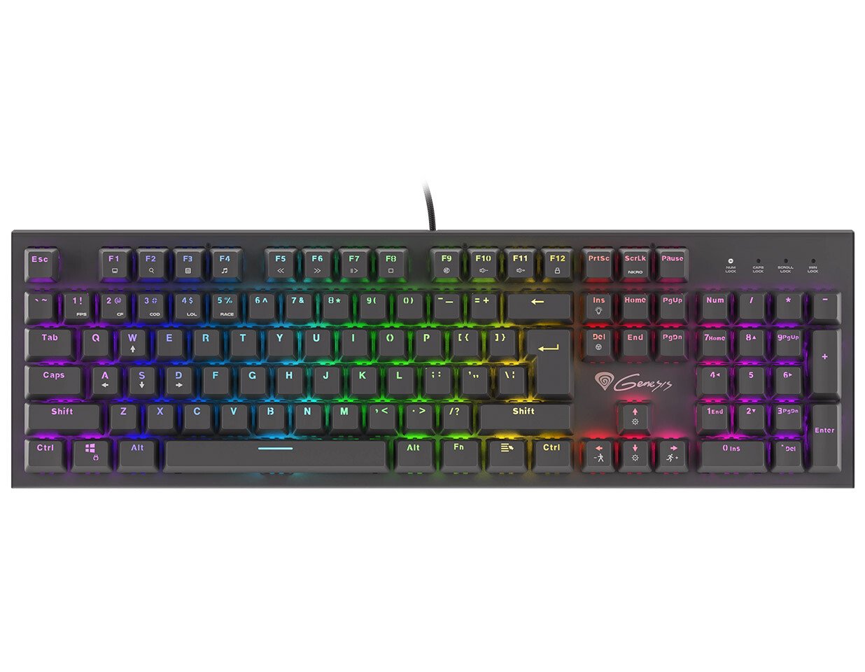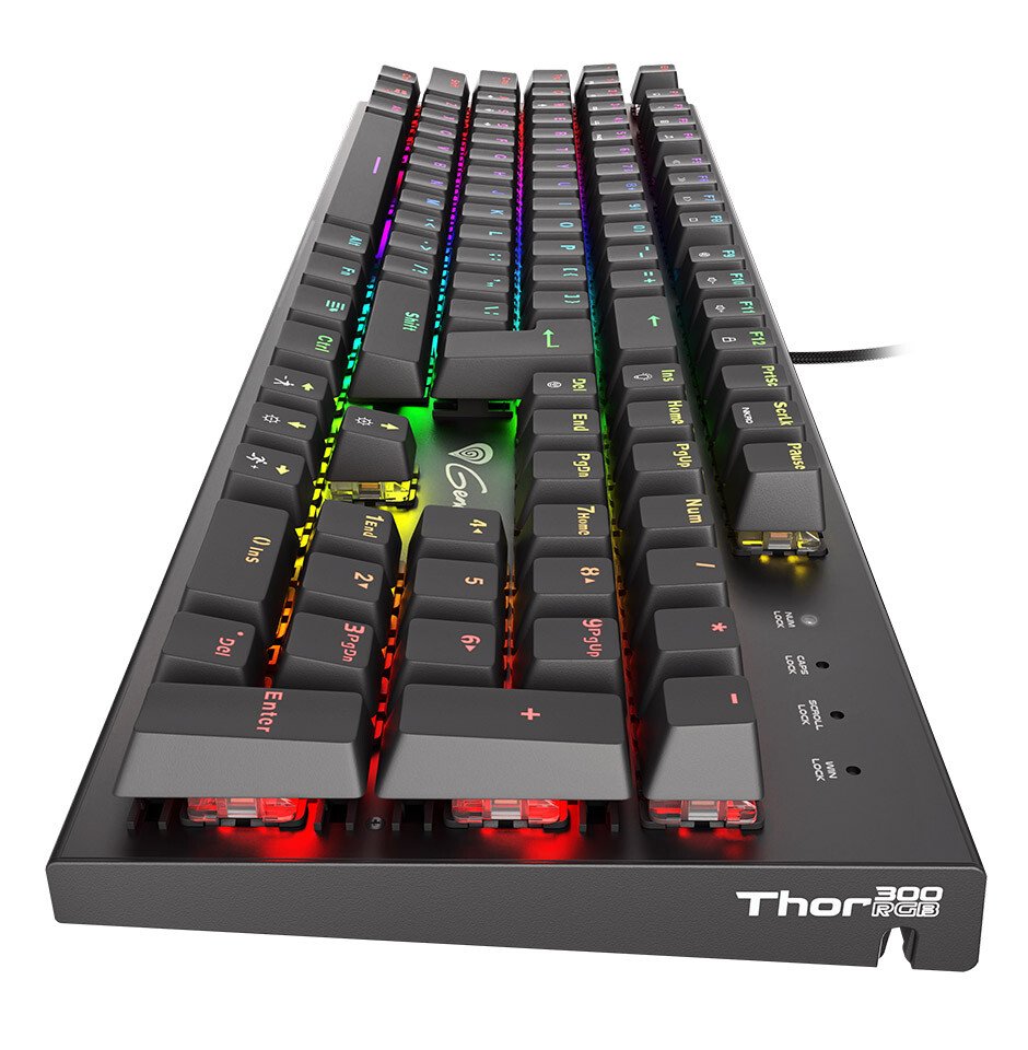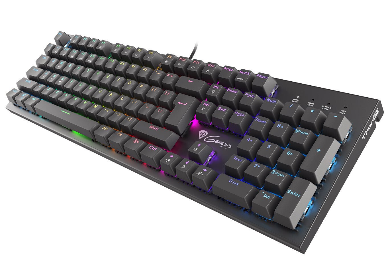 Los interruptores están cubiertos con tapas resistentes al desgaste gracias a la tecnología de doble inyección. El Genesis Thor 300 RGB ofrece a los jugadores la capacidad de presionar todas las teclas a la vez (rollover completo de N-Key), así como la iluminación LED RGB con efecto PRISMO. El fabricante preparó 25 juegos de iluminación, por lo que cada jugador debería encontrar uno a su gusto.