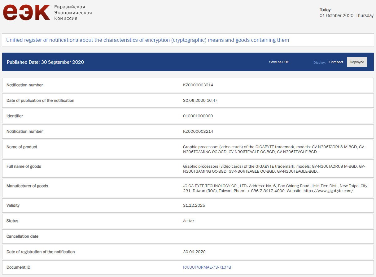Gigabyte ha enviado recientemente cuatro nuevas GPU a la Comisión Económica Euroasiática (encontrada por @KOMACHI_ENSAKA) para su certificación. Estas cuatro tarjetas cuentan con la designación N306T, que se espera que se refiera a la próxima NVIDIA RTX 3060 Ti. Gracias a la estructura de nomenclatura consistente de Gigabyte, podemos hacer una suposición bien fundamentada sobre los próximos modelos al observar sus números de pieza.