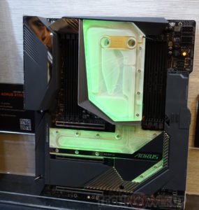 Sin embargo, a la cabeza del paquete está el X299G Aorus Xtreme Waterforce. Este es el nuevo buque insignia de la línea LGA2066 de GIGABYTE. Puede tener solo una conexión de 10 GbE y solo un puerto Thunderbolt 3 de 40 Gbps en comparación con el Designare 10G, pero se completa con un VRM masivo de 16 fases con los componentes de alta corriente más selectos del mercado hoy en día. Un monobloque líquido masivo enfría la CPU VRM, la propia CPU, el X299 PCH y dos de las tres ranuras M.2-22110 de la placa. El canal principal de refrigerante pasa directamente sobre sus SSD. Un disipador de calor secundario transfiere parte del calor de la tercera ranura M.2 de la placa y ciertos otros componentes calientes al monobloque. Hecho de cobre niquelado, el monobloque tiene una tapa acrílica transparente y está tachonado con una constelación de LED RGB direccionables.