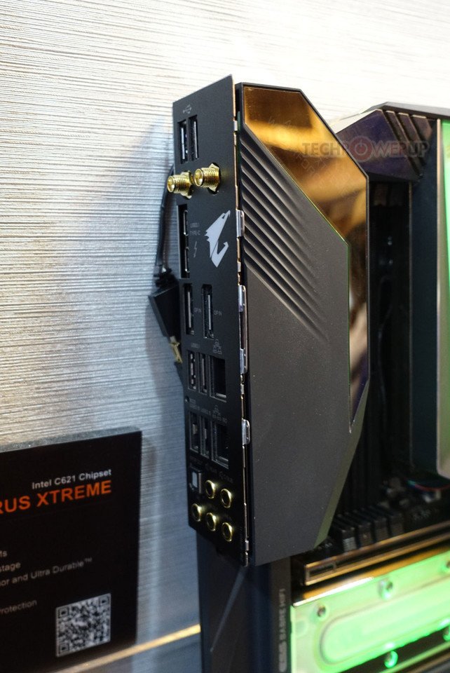El X299G Designare 10G se basa en un PCB ligeramente diferente del X299G Aorus Master, y se coloca una muesca más alta en la pila de productos de GIGABYTE. La CPU VRM es la misma solución basada en PowIRstage IR de 12 fases. El diseño del disipador térmico interconectado también es similar, con la excepción de un disipador térmico adicional cerca del área de audio integrada. Las cosas cambian con la conectividad. La placa tiene una entrada de alimentación PCIe de 6 pines adicional para estabilizar la entrega de potencia. No hay una, sino dos interfaces de 10 GbE, ambas controladas por un controlador Intel de 2 puertos y 10 GbE que tiene una conexión PCI-Express 3.0 x8 al bus del sistema. También obtiene dos conexiones Thunderbolt 3 de 40 Gbps a través de puertos USB-C, ambos con 5 Gbps USB y DisplayPort de paso.