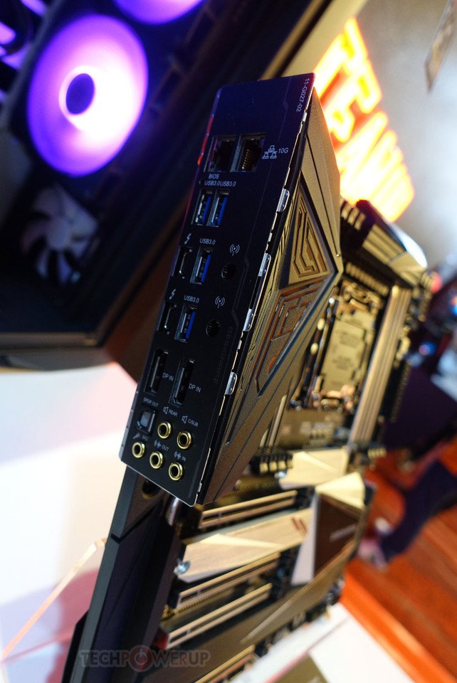 El disipador térmico VRM de la CPU principal arroja una parte de su calor a un disipador térmico secundario cerca de la E / S posterior, que también absorbe el calor de la mitad de los FET de VRM de memoria. El disipador térmico del chipset está interconectado al disipador térmico principal del VRM, así como a otro disipador térmico pequeño en el lado derecho de la placa, que extrae el calor de la otra mitad del VRM de memoria. El disipador térmico ampliado del chipset se extiende como uno de los tres disipadores térmicos M.2 SSD de la placa. La cubierta trasera de E / S que se extiende a lo largo del lado izquierdo prácticamente no se modifica, al igual que la solución de audio integrada a bordo de ESS Sabre que se encuentra debajo.