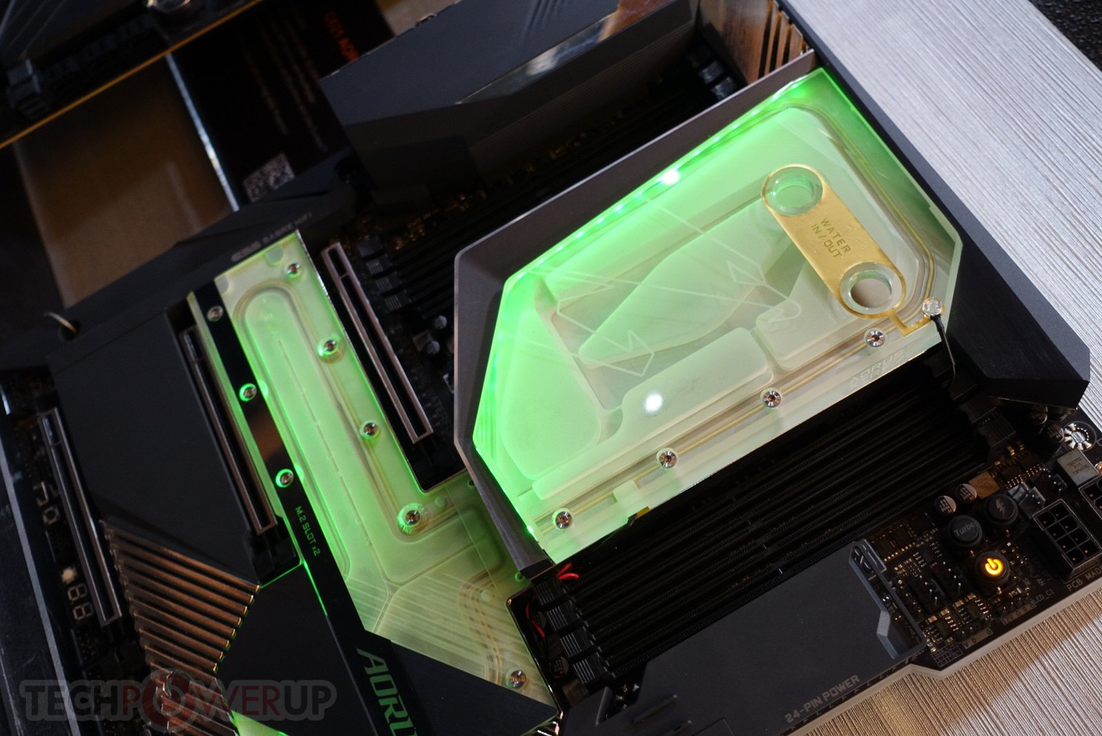 Sin embargo, a la cabeza del paquete está el X299G Aorus Xtreme Waterforce. Este es el nuevo buque insignia de la línea LGA2066 de GIGABYTE. Puede tener solo una conexión de 10 GbE y solo un puerto Thunderbolt 3 de 40 Gbps en comparación con el Designare 10G, pero se completa con un VRM masivo de 16 fases con los componentes de alta corriente más selectos del mercado hoy en día. Un monobloque líquido masivo enfría la CPU VRM, la propia CPU, el X299 PCH y dos de las tres ranuras M.2-22110 de la placa. El canal principal de refrigerante pasa directamente sobre sus SSD. Un disipador de calor secundario transfiere parte del calor de la tercera ranura M.2 de la placa y ciertos otros componentes calientes al monobloque. Hecho de cobre niquelado, el monobloque tiene una tapa acrílica transparente y está tachonado con una constelación de LED RGB direccionables.