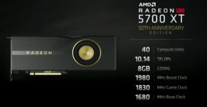 Has oído hablar de eso, y ahora lo verás. AMD presenta una edición conmemorativa de su tarjeta gráfica RX 5700 XT, que devuelve el sufijo XT de la compañía a la calificación de desempeño de la tarjeta de video (preguntándose si una tarjeta de video XTX eventualmente hará su aparición …) – y un nuevo color negro y dorado. esquema. La RX 5700 XT 50th Anniversary Edition contará con un mayor número de relojes en comparación con sus homólogos, con un reloj Boost de hasta 1980 MHz, un reloj de juego de 1830 MHz y un reloj base de 1680 MHz (comparado con 1905 MHz, 1755 MHz y 1605 MHz para el no aniversario).