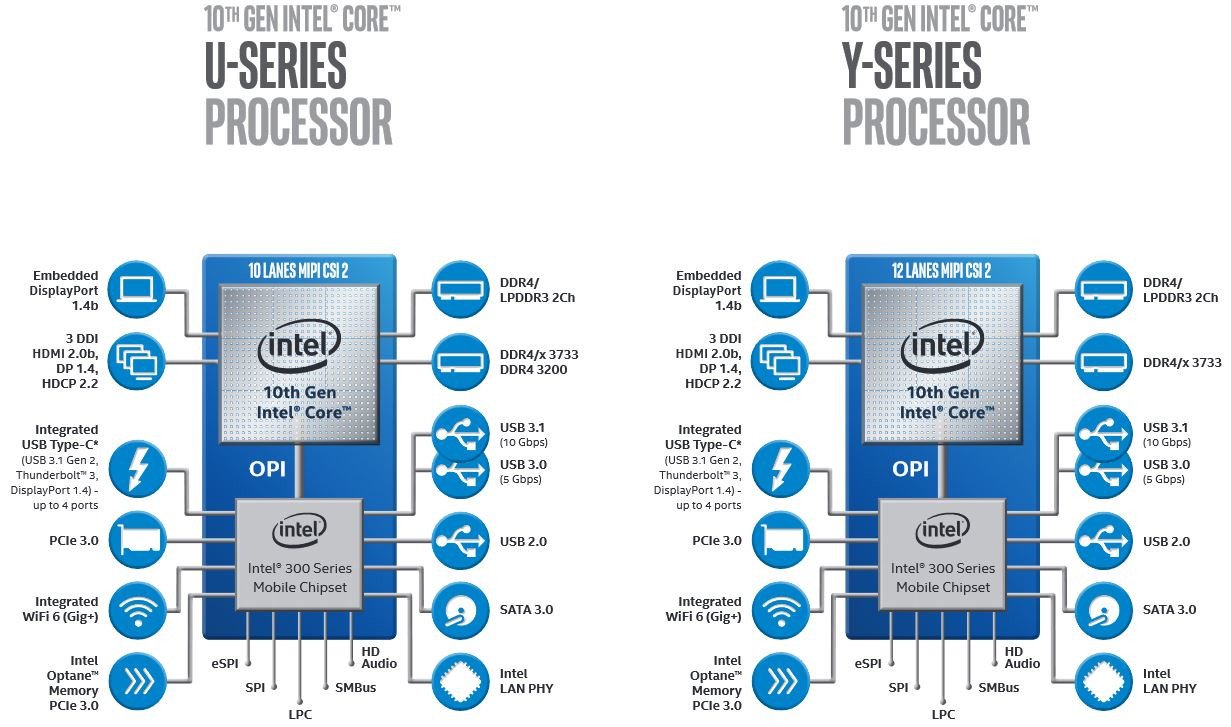 Intel dejó descansar la especulación de que después de la novena generación, podría reemplazar su marca Core por otra cosa. Los procesadores Core de 10ª generación, construidos en torno a la microarquitectura “Ice Lake” de 10 nm, presentarán los primeros incrementos de IPC notables desde “Skylake” gracias a sus nuevos núcleos de CPU “Sunny Cove”. Estos también contarán con DLBoost, un hardware de multiplicación de máxtrix de función fija que acelera la creación y el entrenamiento de redes neuronales profundas en 5x, así como ciertas instrucciones AVX-512. Los núcleos se optimizarán para hacer frente a Wi-Fi 802.11ax de 2.4 Gbps y estándares de Ethernet más rápidos. El primero de estos chips apuntará a las plataformas de computación móvil, y serán partes de cuatro núcleos como las matrices que se muestran a continuación. Para salvar el estado real de la PCB del portátil, Intel colocará el procesador y PCH se extinguirá en un módulo de múltiples chips.