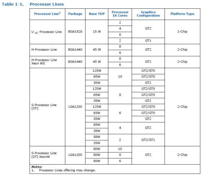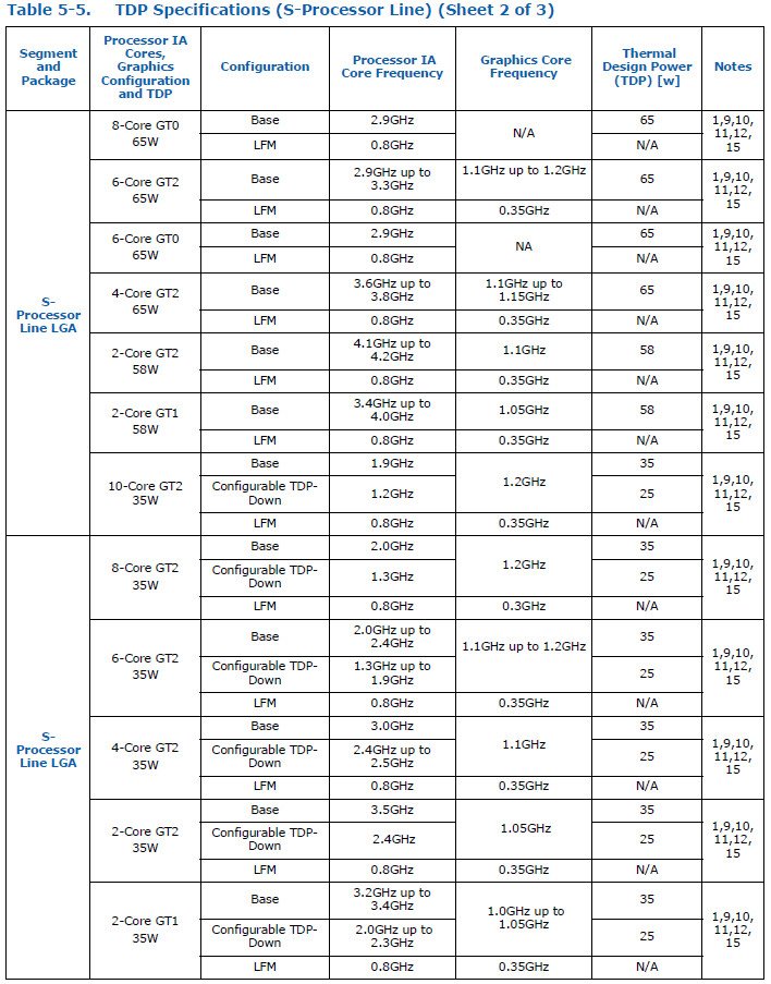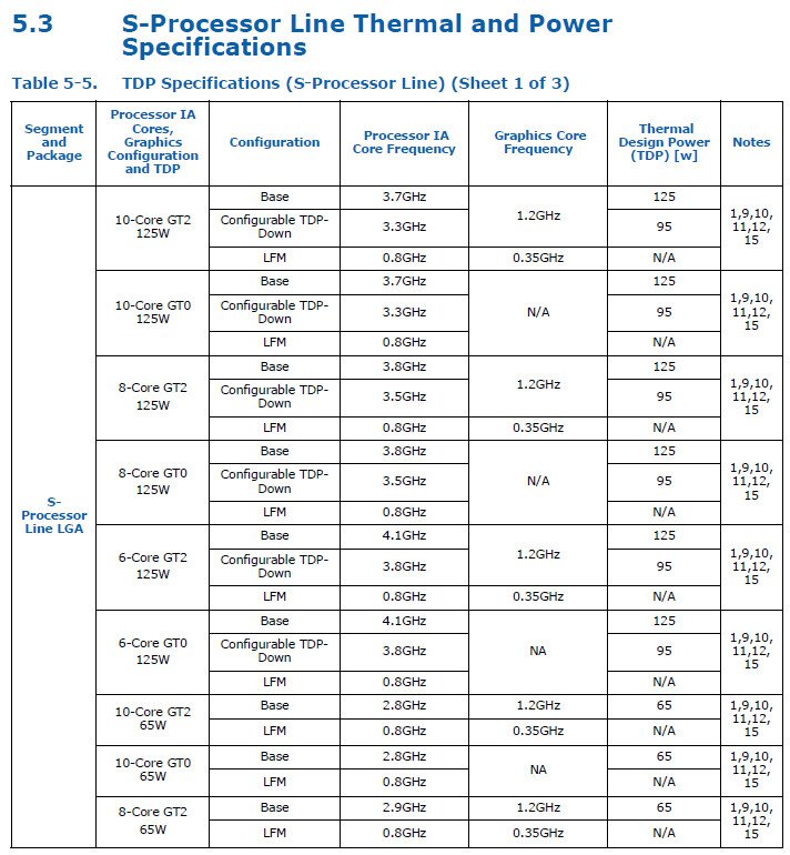 Procesadores Core “Comet Lake” de décima generación de Intel, filtrados, revelan los valores de CPUID, TDP y TDP configurable de las diversas SKU de escritorio. Intel clasifica ampliamente a Comet Lake por conteo de núcleos y nivel de iGPU complementario. El dado Comet Lake de 10 núcleos se envía con TDP de 125 W, 65 W y 35 W, para los SKU K / KF, bloqueados y T-SKU, respectivamente.