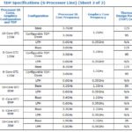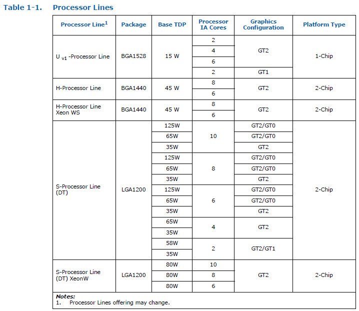 Para el escritorio Comet Lake-S, solo hay dos niveles de iGPU, GT2 (iGPU presente en el sabor UHD 630), o completamente deshabilitado (denotado como GT0). Los cuadros que detallan las velocidades de reloj que no son Turbo revelan que la presencia o ausencia de iGPU no tiene impacto en las frecuencias de TDP, cTDP o CPU. El silicio “Comet Lake” de 10 núcleos + GT2 está listado con un CPUID de A0655h, mientras que las variantes de 6 núcleos + GT2 y 4 núcleos + GT2 comparten el CPUID A0653h.