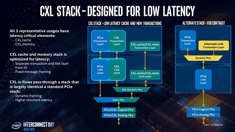CXL utiliza la capa física PCIe y tiene un ancho de banda sin formato en el papel de 32 Gbps por línea, por dirección, que se alinea con el estándar PCIe gen 5.0. La capa de enlace es donde está toda la salsa secreta. Intel trabajó en un nuevo protocolo de intercambio, negociación automática y protocolos de transacción que reemplazan a los de PCIe, diseñados para superar las deficiencias enumeradas anteriormente. Con PCIe gen 5.0 ya estandarizado por PCI-SIG, Intel podría compartir la IP de CXL con SIG en PCIe gen 6.0. En otras palabras, Intel admite que CXL no puede sobrevivir a PCIe, y hasta que PCI-SIG pueda estandarizar la generación 6.0 (alrededor de 2021-22, si no más tarde), CXL es la necesidad de la hora.
