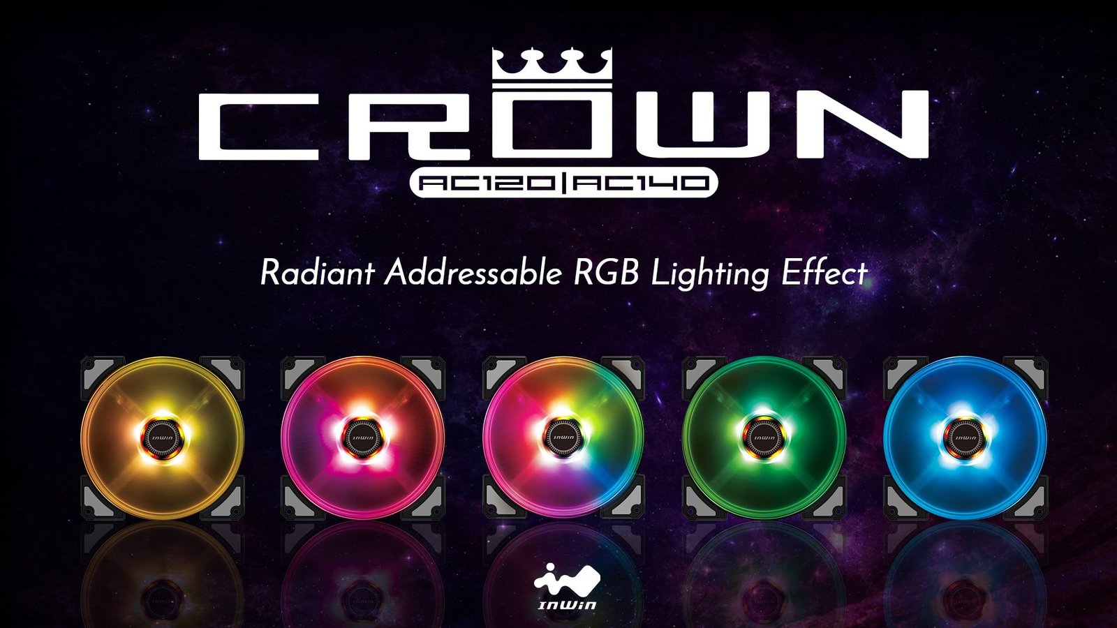 Seis LEDs RGB centrales son controlados por un IC independiente, lo que permite efectos de iluminación RGB totalmente personalizables y direccionables que brillan hacia afuera en las hojas escarchadas. Se suministra un cable direccionable que se conecta a los encabezados RGB direccionables de 3 pines en las placas madre compatibles para sincronizar y operar con su software y controlar los efectos de iluminación. En el paquete CROWN Twin Pack, se suministra un controlador modular RGB para permitir el control de los efectos de color de forma independiente.