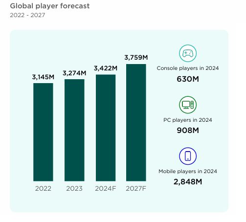 La cantidad de jugadores a nivel mundial alcanzará los 3420 millones en 2024, un aumento interanual del 4,5%. El crecimiento de los jugadores de PC impulsará este aumento sustancialmente. En ese sentido los ingresos monetarios por PC, que aumentaron un 4% interanual hasta los 43.200 millones de dólares, superarán los ingresos de los móviles y las consolas este año. (Ver recuadro Pronóstico del jugador global – Global player forecast)