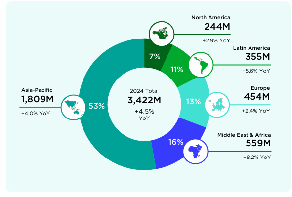 El número total de jugadores en todos los mercados crecerá. Asia- Pacífico, donde se encuentra el 53 % de los jugadores globales, verá crecer su base de jugadores un 4% interanual hasta alcanzar los 1.800 millones de jugadores en 2024. La mayor parte de este crecimiento está impulsado por jugadores en los mercados de Asia central y del sudeste asiático. Oriente Medio y África, donde se priorizan los dispositivos móviles, y América Latina, que albergan al 16 % y el 10 % de los jugadores del mundo, respectivamente, seguirán creciendo más que las otras regiones. El crecimiento de jugadores en América del Norte y Europa ascenderá a un 2,9 % y un 2,4 % interanual, respectivamente.