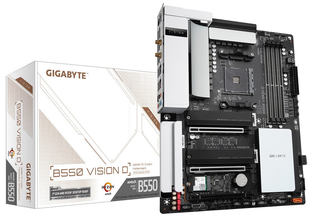 El GIGABYTE B550 VISION D también incorpora diseño de hardware y materiales avanzados, que incluyen un diseño de energía mejorado, soluciones térmicas optimizadas, red inalámbrica dual Intel gigabit Ethernet y Wi-Fi 6, que brinda almacenamiento de datos de alta velocidad y experiencia de red a los creadores. Tghe B550 VISION D admite memoria ECC para la verificación y corrección de errores instantáneos. Cuando se combina con la tarjeta gráfica Quadro, la B550 VISION D ofrece una calidad más estable y precisa.