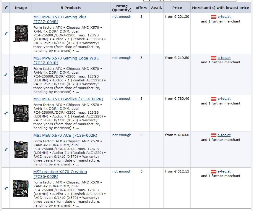 El agregador europeo de precios de componentes para PC Geizhals tiene una lista parcial de placas base X570 de otro fabricante importante, MSI. Aquí se debe tener en cuenta que, si bien la lista de precios de ASUS fue para los precios minoristas del primer día, estos precios de las juntas de MSI son listados tempranos y podrían ser marcados por el minorista.