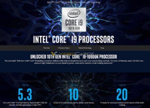 Los materiales de marketing de los próximos procesadores de escritorio Core “Comet Lake-S” de la décima generación de Intel filtrados a la web confirman los recuentos de núcleos de la línea. La serie estará dirigida por procesadores Core i9 de 10 núcleos / 20 hilos, con frecuencias de aumento de velocidad térmica de hasta 5,30 GHz. La serie Core i7 consistirá en procesadores de 8 núcleos / 16 hilos, con frecuencias TVB de hasta 5.10 GHz. La serie Core i5 obtiene su mayor oportunidad en el brazo, con la introducción de HyperThreading por primera vez en 8 generaciones (los últimos procesadores de escritorio Core i5 con HTT fueron chips Core de primera generación de doble núcleo). Los chips de la 10a generación de la serie Core i5 son de 6 núcleos / 12 hilos, con velocidades de reloj de hasta 4,80 GHz.