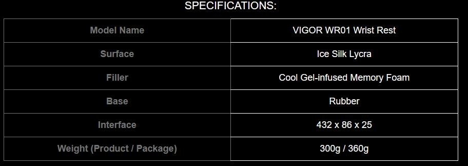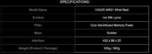 VIGOR WR01 La forma ergonómica del VIGOR WR01 proporciona a los jugadores una comodidad y un apoyo óptimos con cualquier teclado de tamaño completo. La superficie de la tela es suave y fresca al tacto, está hecha de lycra de seda helada con un recubrimiento antibacteriano. Una espuma viscoelástica especialmente diseñada mantiene las manos del jugador frescas y cómodas durante las sesiones de juego. La base de goma es transpirable y antideslizante, lo que la hace más estable en su escritorio.