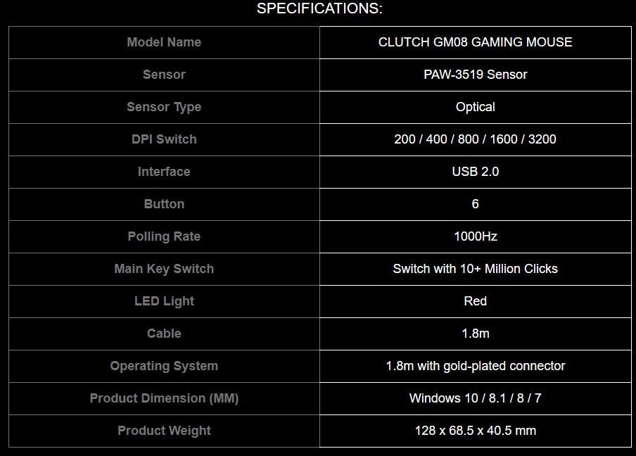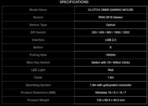 Clutch GM08 Juego de ratón para juegos con una comodidad incomparable: el Clutch GM08 es una buena arma para los jugadores que buscan un peso ajustable para tener un excelente control en el juego. El mouse puede ser manejado por jugadores zurdos y diestros gracias a su forma simétrica. Una rueda de desplazamiento grabada con líneas y agarraderas laterales le brindan una gran precisión y una sensación cómoda.