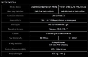 - Impresionante iluminación RGB por tecla y varios efectos: VIGOR GK50 ELITE viene con una impresionante iluminación RGB por tecla y más de 8 ajustes preestablecidos de efectos usando las teclas de acceso rápido. Los indicadores de Numlock y Cap también cambian para un efecto del 100% en todo el teclado.