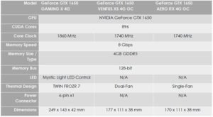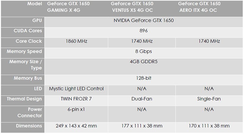 Equipada con excelentes soluciones térmicas, la serie MSI GeForce GTX 1650 está diseñada para proporcionar velocidades de reloj de memoria y de núcleo más altas para un mayor rendimiento en los juegos. La serie GAMING de MSI ofrece la mejor calidad en el juego y el rendimiento térmico que los jugadores esperan de MSI. Con diseños sólidos y nítidos, ARMOR y VENTUS proporcionan un gran equilibrio con un fuerte enfriamiento de doble ventilador y un rendimiento excepcional. El AERO ITX es una excelente opción para los jugadores que buscan incluir el poder de Turing en un pequeño factor de forma. Con esta línea completa hay muchas opciones para cualquier construcción.