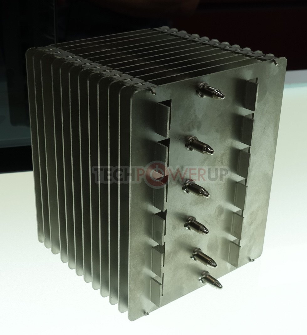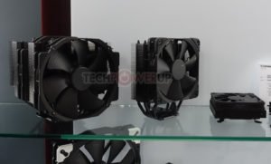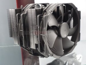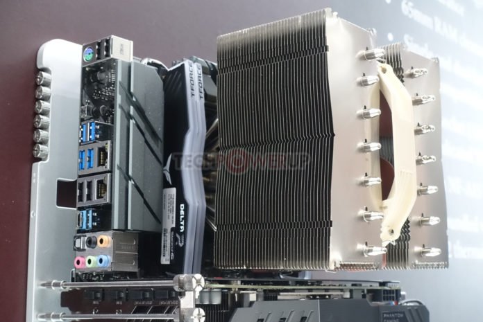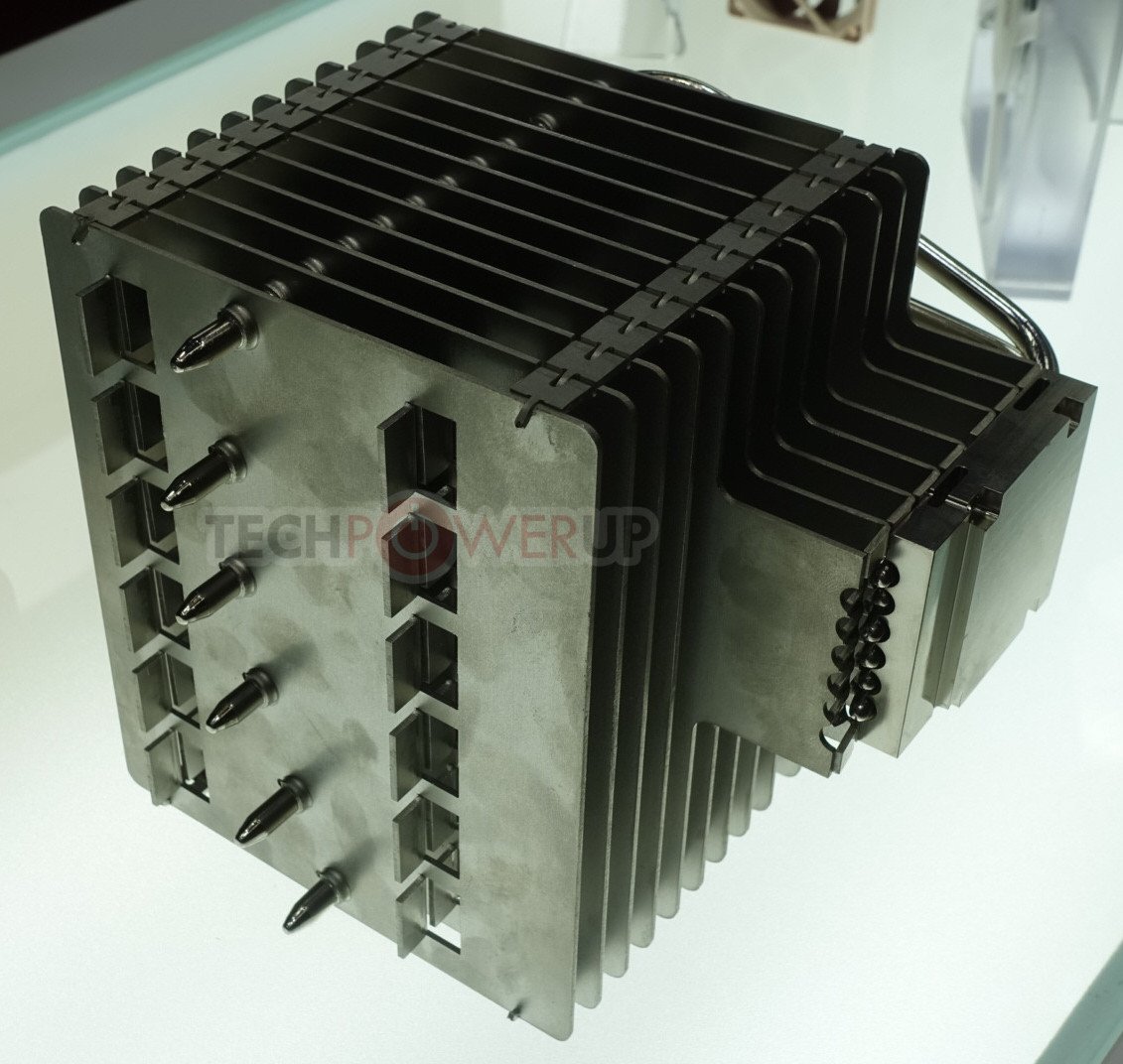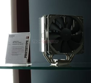 Tomando una dirección diferente, también tenían un refrigerador sin ventilador en exhibición también. Fue diseñado completamente a la medida para enfriamiento por convección natural (pasivo) con una mejora del rendimiento general con poco ruido, ventiladores de caja, en una configuración semi-pasiva. Los usuarios también pueden montar un ventilador directamente en el disipador de calor, pero eso anularía el propósito de un diseño sin ventilador. En lo que respecta al rendimiento real, los objetivos se enumeraron como 120 vatios en una caja sin ventilador con excelente enfriamiento por convección natural o hasta 180 vatios con ventiladores de caja silenciosa o cuando son enfriados directamente por un ventilador silencioso. El diseño en sí mismo es asimétrico para una mejor separación de PCIe y una compatibilidad de memoria del 100% en ambos zócalos AM4 y LGA 115x. Al igual que el nuevo enfriador tipo D, este modelo sin ventilador vendrá incluido con el nuevo compuesto térmico NT-H2 de Noctua. ETA se enumera como 2020.