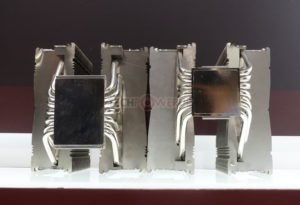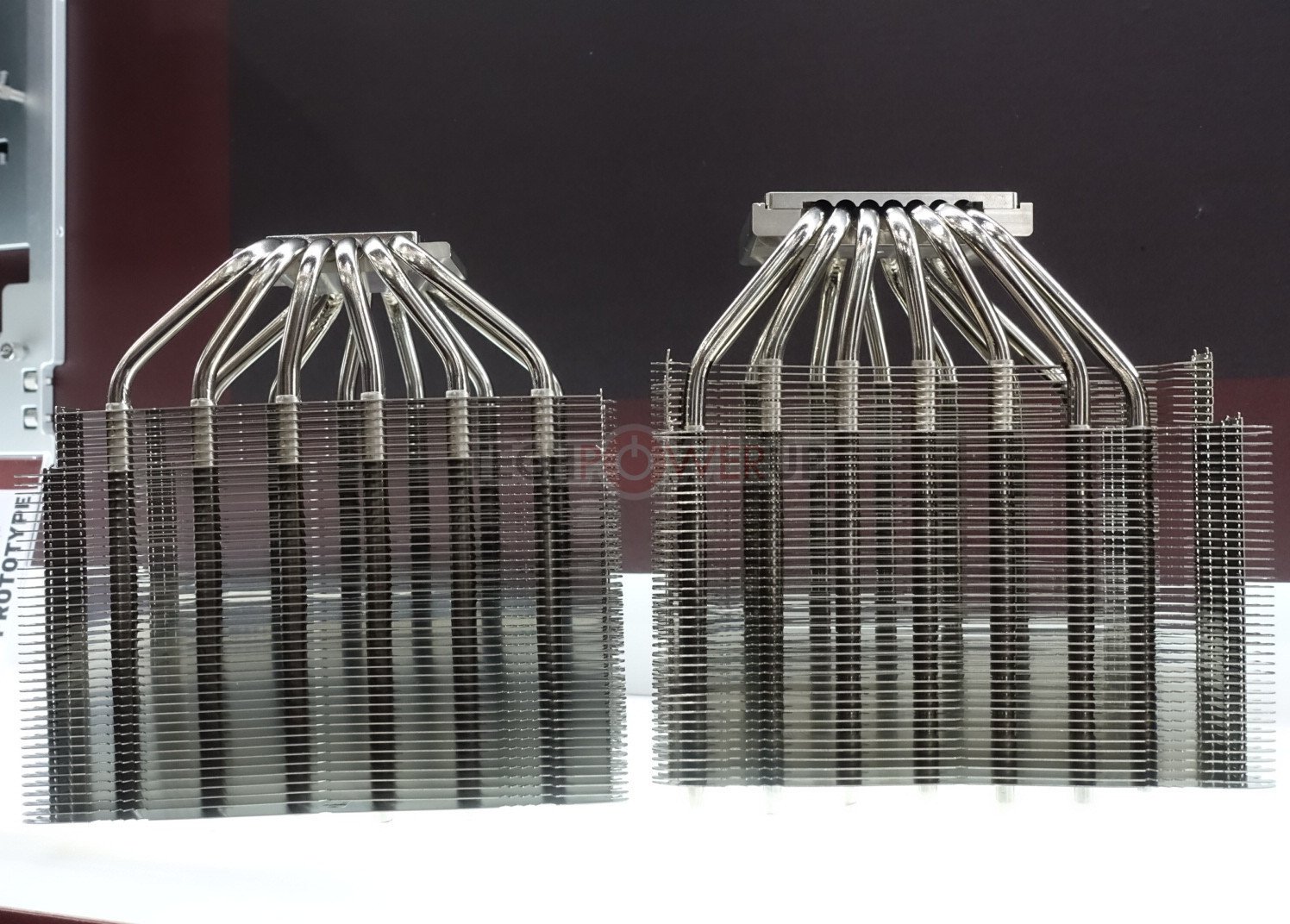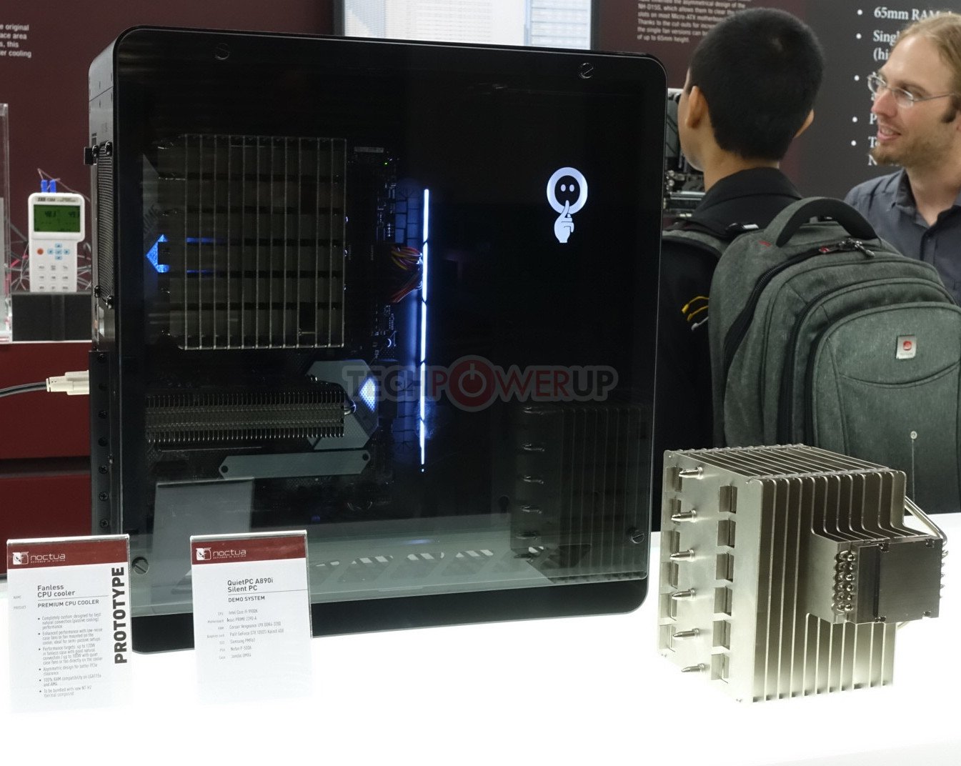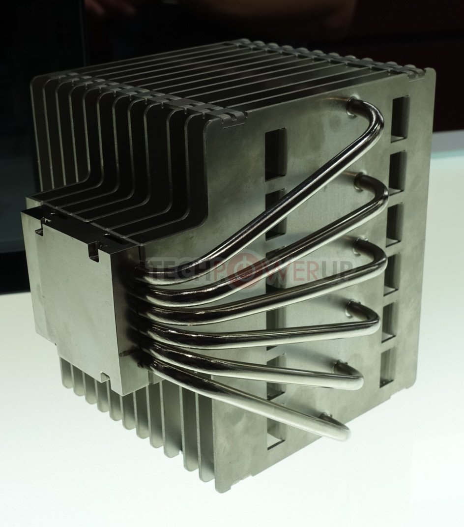 Tomando una dirección diferente, también tenían un refrigerador sin ventilador en exhibición también. Fue diseñado completamente a la medida para enfriamiento por convección natural (pasivo) con una mejora del rendimiento general con poco ruido, ventiladores de caja, en una configuración semi-pasiva. Los usuarios también pueden montar un ventilador directamente en el disipador de calor, pero eso anularía el propósito de un diseño sin ventilador. En lo que respecta al rendimiento real, los objetivos se enumeraron como 120 vatios en una caja sin ventilador con excelente enfriamiento por convección natural o hasta 180 vatios con ventiladores de caja silenciosa o cuando son enfriados directamente por un ventilador silencioso. El diseño en sí mismo es asimétrico para una mejor separación de PCIe y una compatibilidad de memoria del 100% en ambos zócalos AM4 y LGA 115x. Al igual que el nuevo enfriador tipo D, este modelo sin ventilador vendrá incluido con el nuevo compuesto térmico NT-H2 de Noctua. ETA se enumera como 2020.